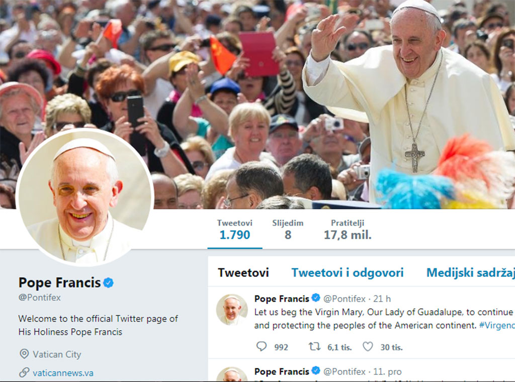 Papin Twitter račun na devet jezika prati sve više ljudi. Ukupno ima više od 47 700 000 pratitelja, a najviše ih je na računu na engleskom jeziku, koji ima gotovo 17 milijuna pratitelja. Nakon toga slijede onaj na španjolskom (s više od 16 milijuna), zatim na talijanskom (s gotovo pet milijuna pratitelja), portugalskom (s četiri milijuna), te francuskom i poljskom (svaki od njih ima više od milijun pratitelja). Račun na latinskom jeziku ima gotovo 900 000 pratitelja, onaj na njemačkom više od 600 000, a račun na arapskom jeziku prati više od 400 000 osoba, piše Radio Vatikan.