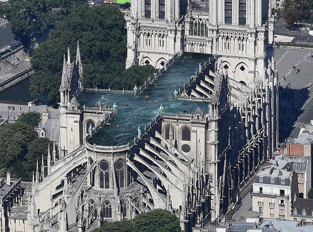 U skladu s najavom francuske vlade koja želi moderan, suvremeni redizajn, arhitekti tvrtke Ulf Mejergren iz Stockholma (UMA) kažu da bi krov gotičke crkve trebao postati "novi meditativni prostor s neusporedivim pogledom na Pariz". Kako bi vratila Notre Dame „gradu i narodu“ tvrtka želi postaviti „veliki javni bazen koji zauzima cijeli krov“.