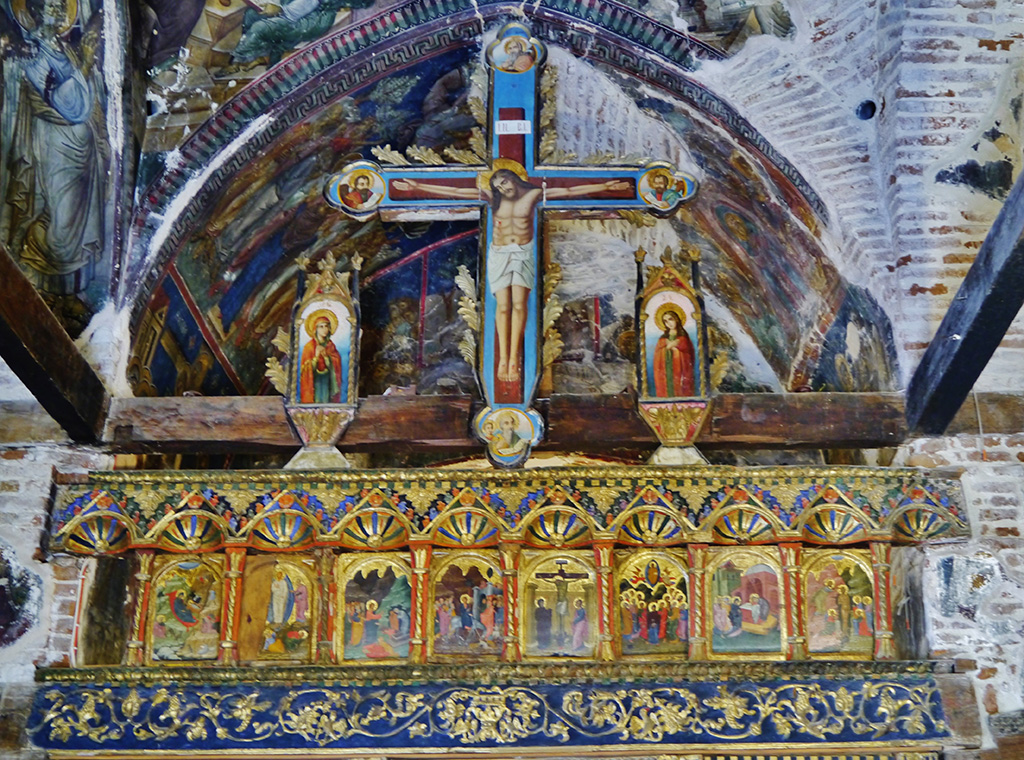 Crkva Timosa Stavrosa prvotno je, u 12. stoljeću, bila sagrađena kao jednokatna građevina s kupolom. Debela kamena vanjština skriva zadivljujuće freske koje datiraju između 12. i 14. stoljeća. Sjeverni prolaz nekada je služio kao privatna kapela lokalnog gospodara.