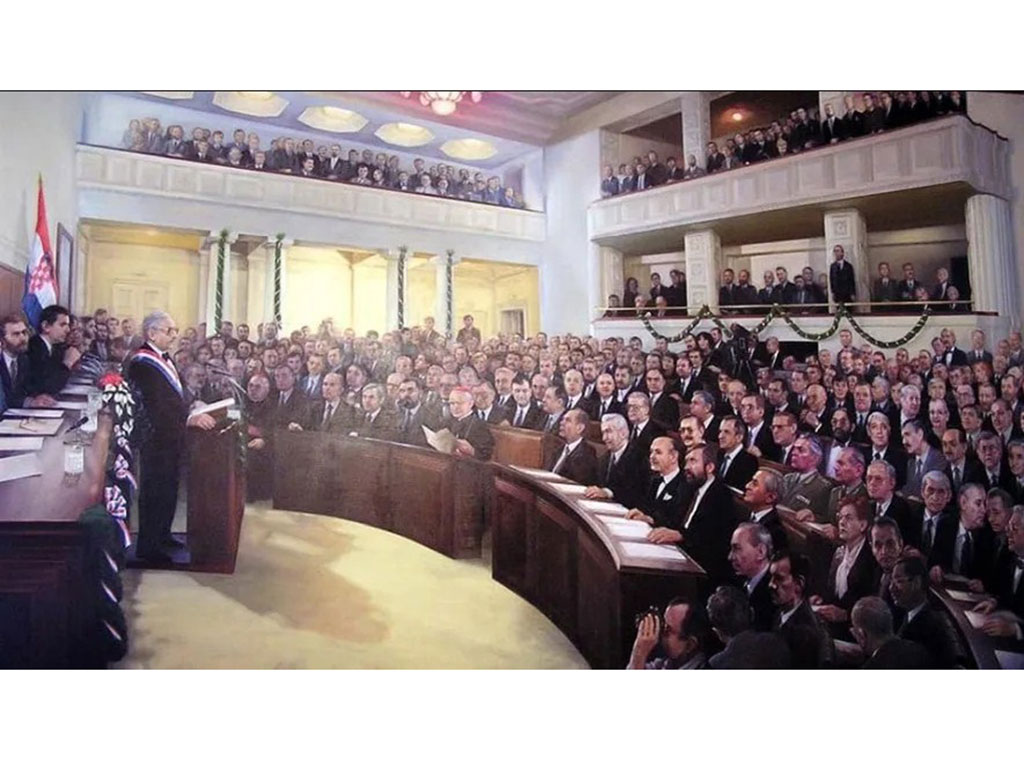 U Saboru je toga dana bilo vrlo svečano. Bilo je malo mjesta za sve uzvanike koji su očekivali proglašenje novog hrvatskog Ustava, prvog ustava nakon slobodnih izbora te višestranačja i prvog demokratskog ustava u povijesti Hrvatske, piše povijest.hr.