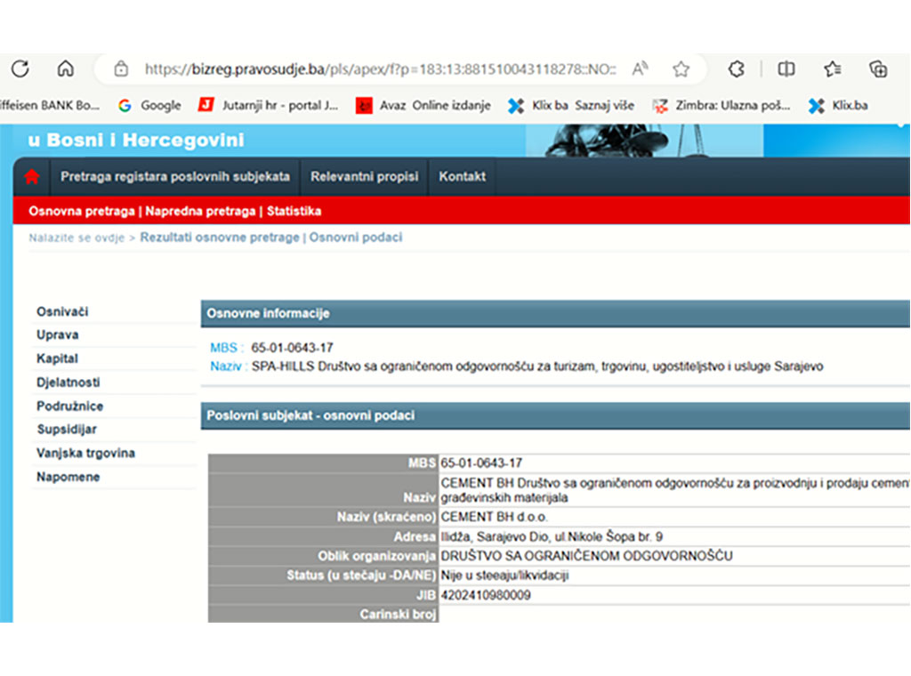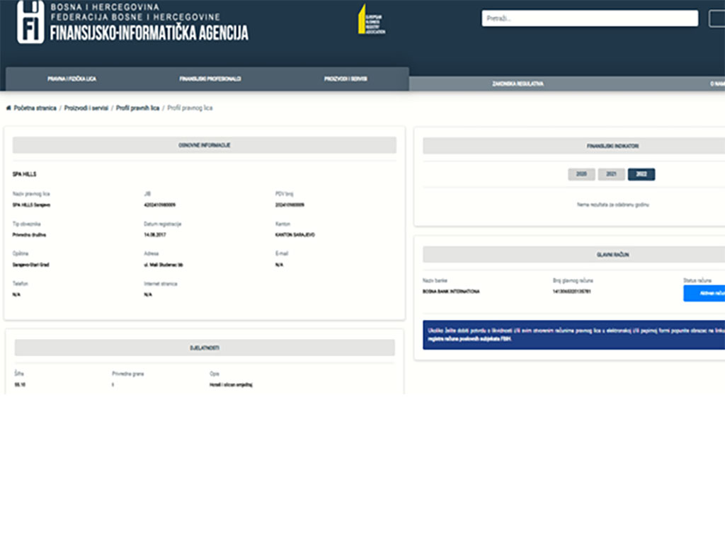 Tu pak nalazimo da se tvrtka SPA-Hills d.o.o. Sarajevo nalazi u registru FIA-e, da ima račun kod BBI banke, ali financijski podaci za nju ne postoje za 2020., 2021. i 2022. godinu. To znači da tvrtka SPA-Hills nije predala završne račune u FIA-u za rečene godine.