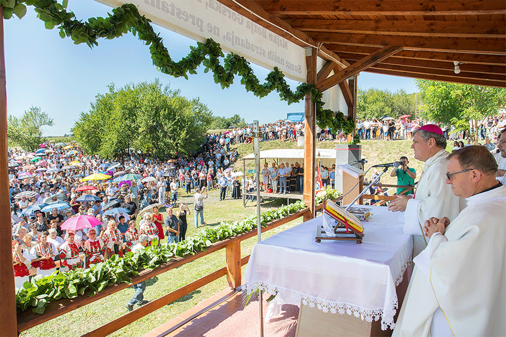 U homiliji je biskup istaknuo kako se Marija osim radosnom s pravom naziva i Žalosnom Gospom, a u Gori i Majkom naših stradanja. „Ona se doista žalostila i mnogo patila – i kad je Isusa rodila u odbačenosti u Betlehemu, među životinjama, u štali; i kad je s Isusom i Josipom bježala u Egipat pred kraljem Herodom koji je želio ubiti novorođenče; i kad je, osobito tada, išla za svojim sinom Isusom koji je osuđen na smrt nosio svoj križ na Kalvariji gdje je bio i raspet te gledala patnje i njegovo umiranje; kad su joj njegovo mrtvo tijelo položili u krilo! Stabat Mater dolorosa! Ali ona i danas s nama pati i žalosna je kad gleda kako se naše obitelji boje rađati djecu, kako se bore otac i majka da othrane obitelj a nemaju posla, kad odlaze naši mladi ali i čitave obitelji u inozemstvo i napuštaju lijepu našu domovinu...“, iznio je biskup.