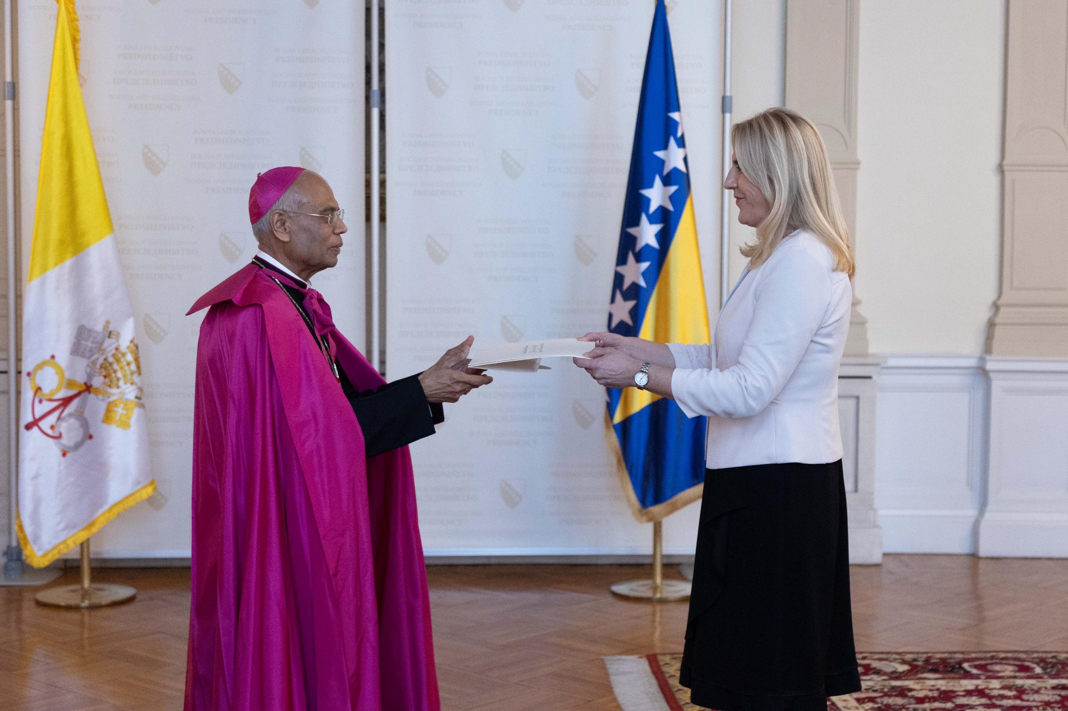 Predajući vjerodajna pisma, mons. Chullikatt je prenio srdačan pozdrav pape Franje, zaželjevši Božju pomoć u svim nastojanjima novog saziva tročlanog Predsjedništva BiH, usmjerenog ka rješavanju tekućih izazova s kojima se svakodnevno suočavaju svi žitelji, a posebice oni iz najpotrebitijih i najranjivijih skupina.