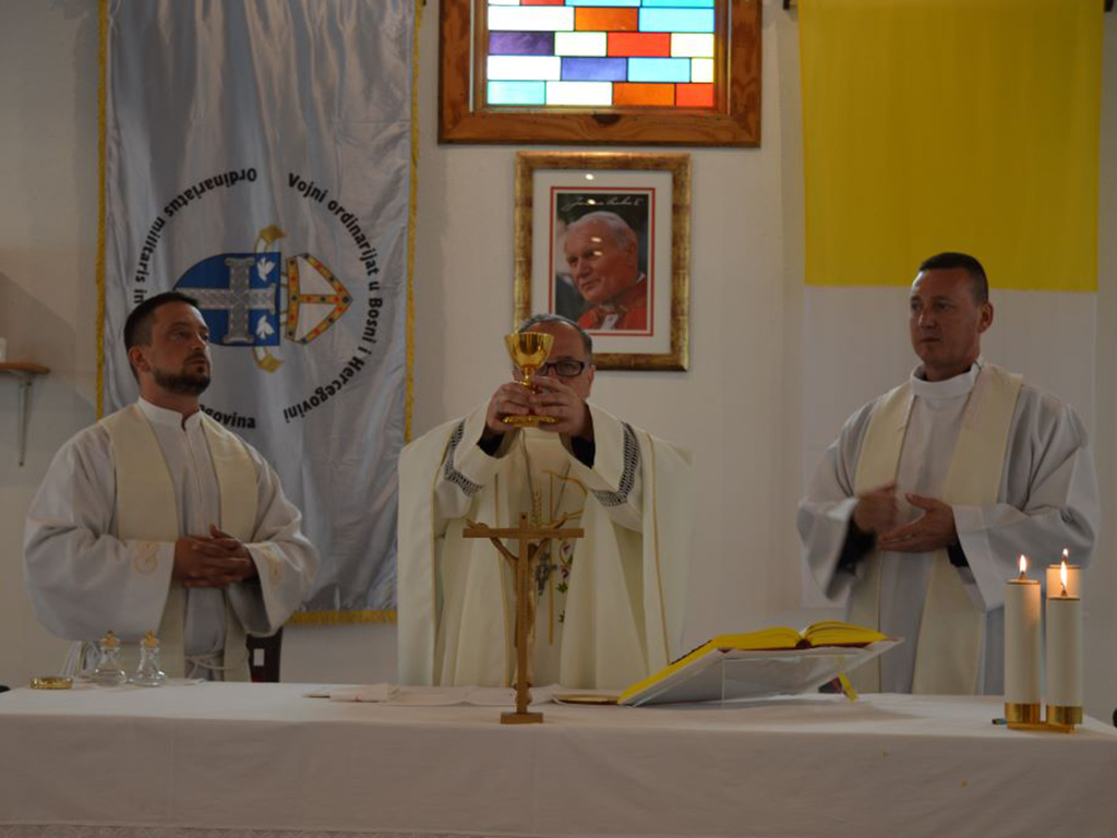 Mons. Relota najprije je slavio svetu misu u vojnoj kapeli posvećenoj Sv. Ivanu Pavlu II. Uz biskupa su koncelebrirali vojni kapelan vlč. Ljubo Zelenika i vlč. Tadić.