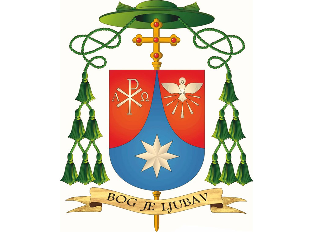 Na heraldički desnom crvenom zastoru nalazi se Kristogram ΧΡ između grčkih slova alfa i omega, koja označavaju Krista Božjega pomazanika. Na heraldički lijevom crvenom zastoru nalazi se golub sa sedam zraka, kao simbol Duha Svetoga i sedam njegovih darova koje biskup dijeli sakramentom svete krizme.