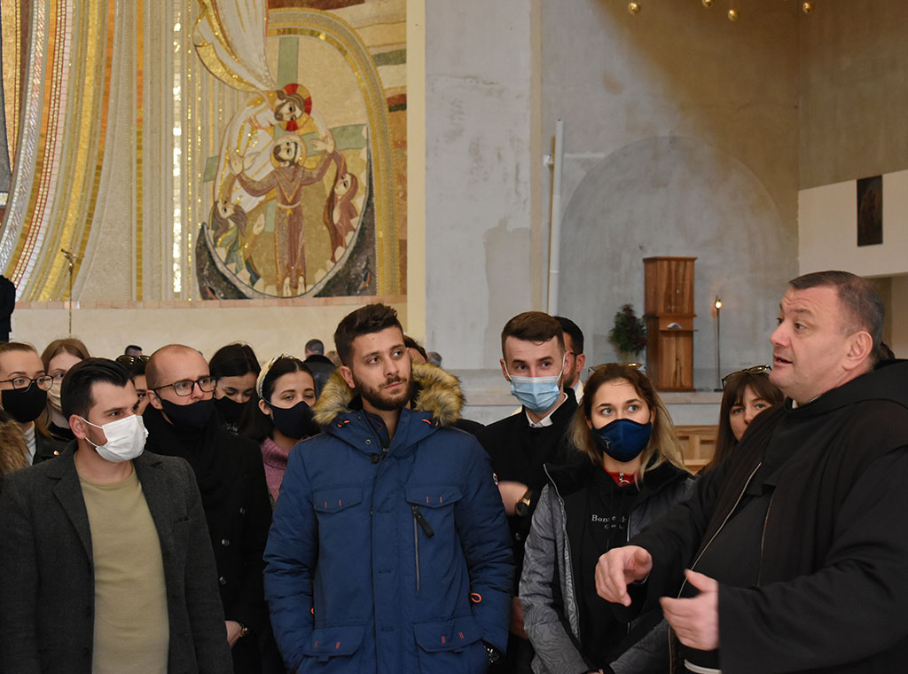 Prvog dana putovanja mladi su najprije posjetili Franjevački samostan i crkvu Svetih Petra i Pavla gdje ih je gvardijan fra Danko Perutina upoznao s arhitektonskom i duhovnom vrijednošću crkve i samostana za katolički puk ovoga kraja, ali i za cijelu Bosnu i Hercegovinu. Oni su ovom prigodom mogli prvi put vidjeti unutrašnjost zdanja koje se odlikuje iznimnom umjetničkom vrijednošću te čiju oltarsku apsidu odnedavno krasi mozaik izrađen pod vodstvom umjetnika p. Marka Ivana Rupnika. Uslijedio je posjet bogatoj knjižnici koja se nalazi u kompleksu samostana, a o kojoj je mladima pričao fra Ante Marić.