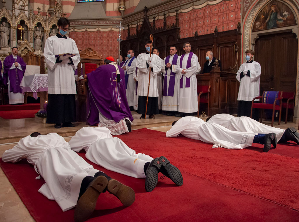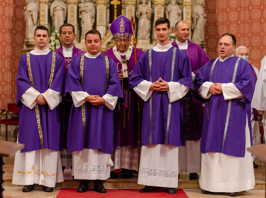 Kard. Puljić polaganjem ruku i posvetnom molitvom kandidatima je podijelio sakrament svetoga reda đakonata. Potom su novozaređeni đakoni, uz pomoć svojih župnika, obukli službenu liturgijsku odjeću te na kraju obreda primili evanđelistar iz nadbiskupovih ruku, i s njim izmijenili cjelov mira (u skladu s epidemiološkim mjerama), a zatim pristupili služenju kod oltara.