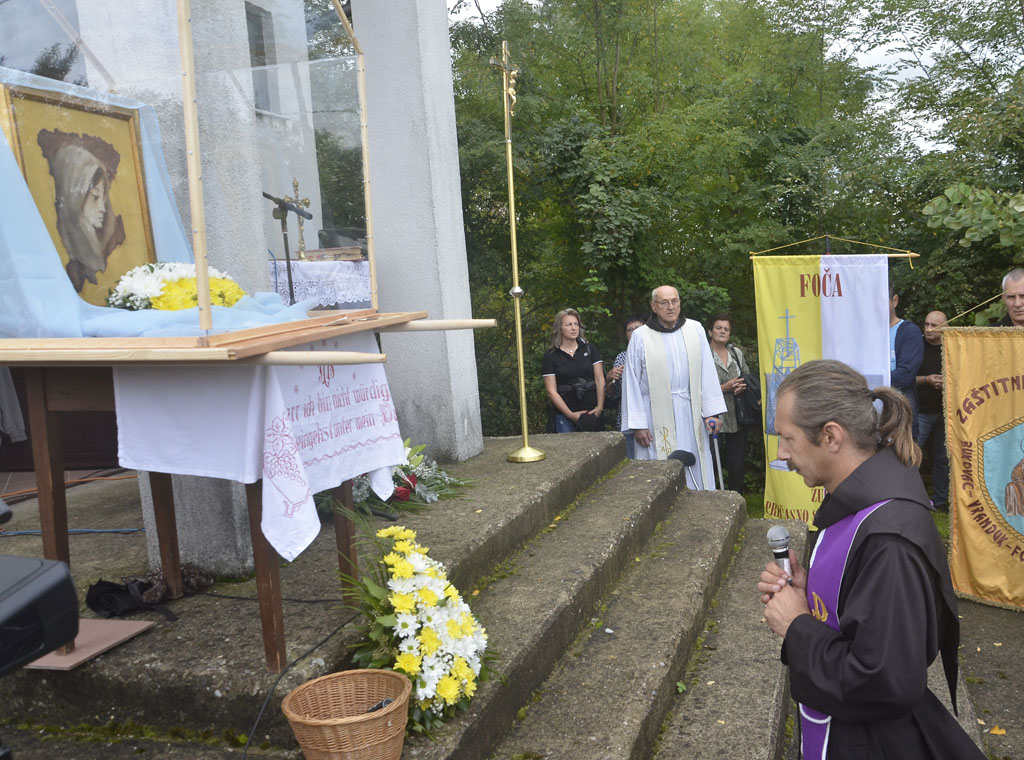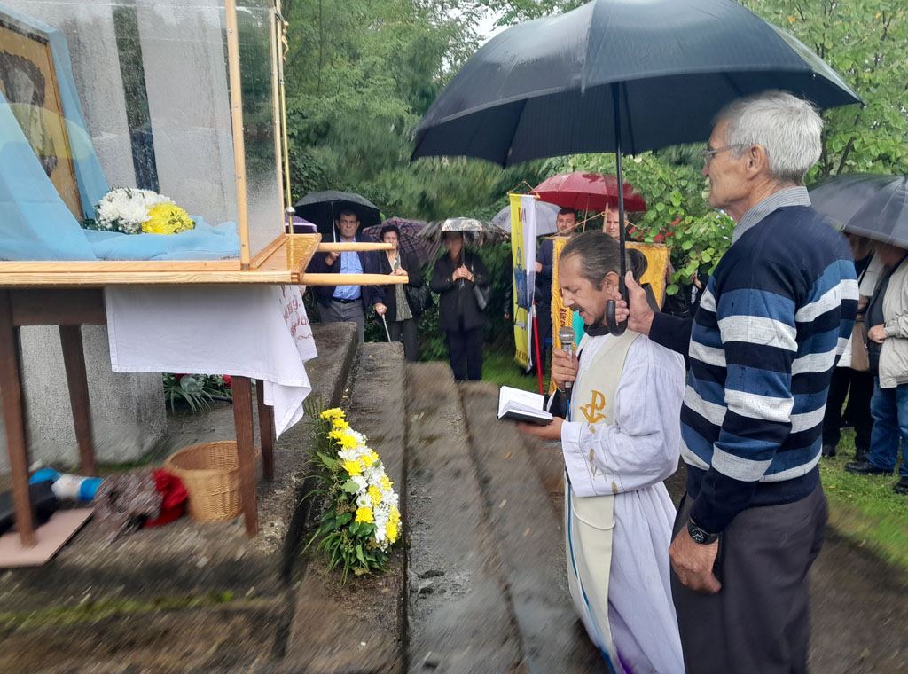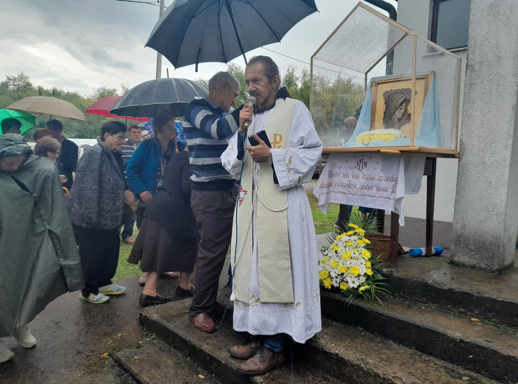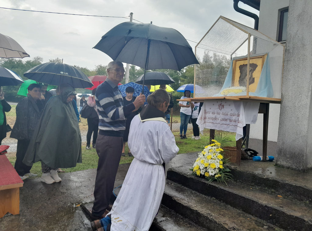 Ni kiša koja je povremeno padala nije spriječila hodočasnike da dostojanstveno u dvorištu crkve sudjeluju na misnom slavlju, koje je uz župnika fra Franju Dalibora Stjepanovića i još šest svećenika predvodio profesor na Franjevačkoj teologiji u Sarajevu fra Ivan Šarčević.