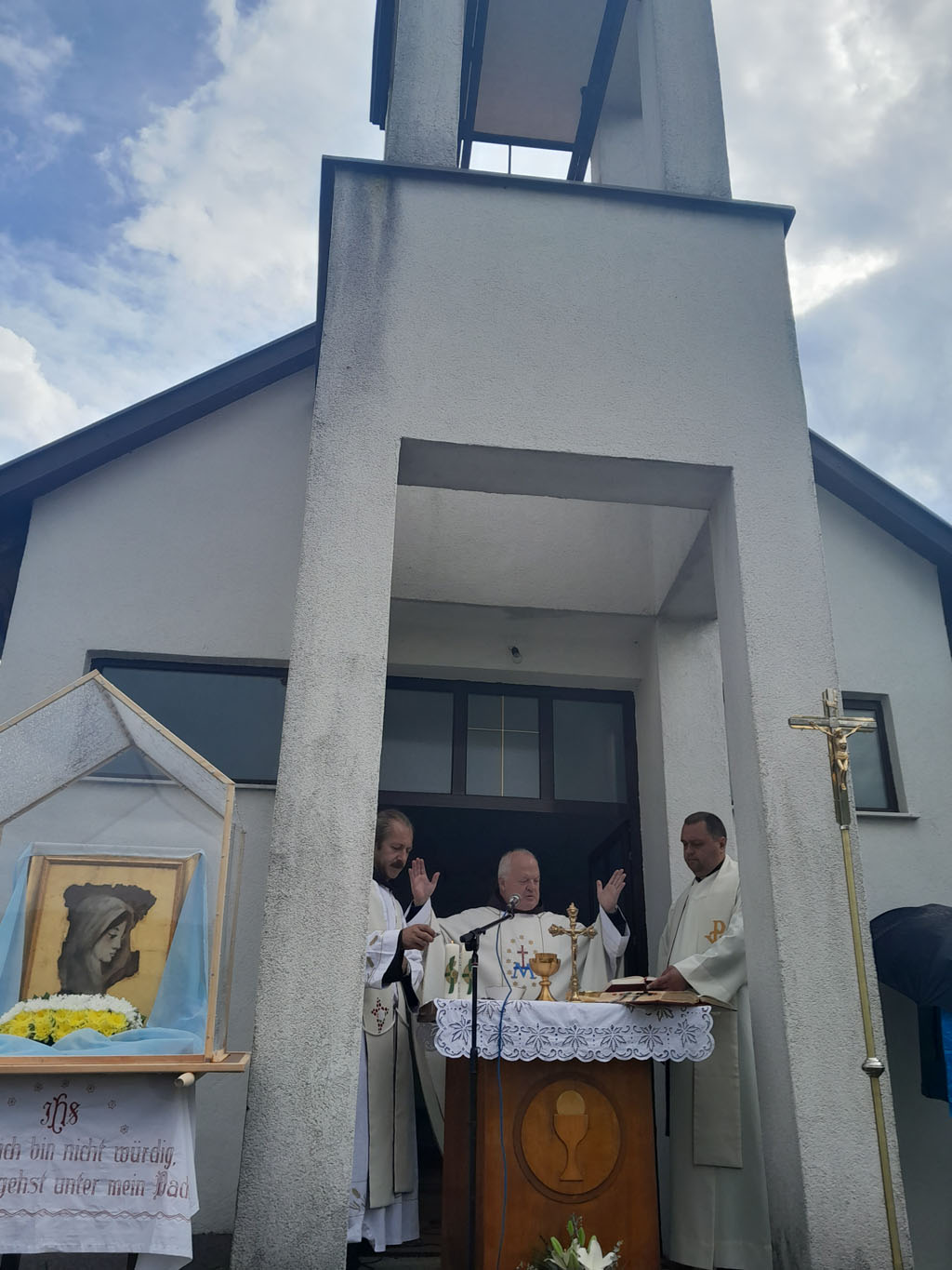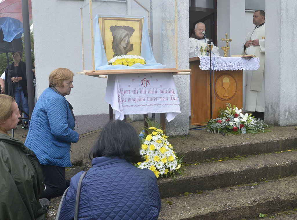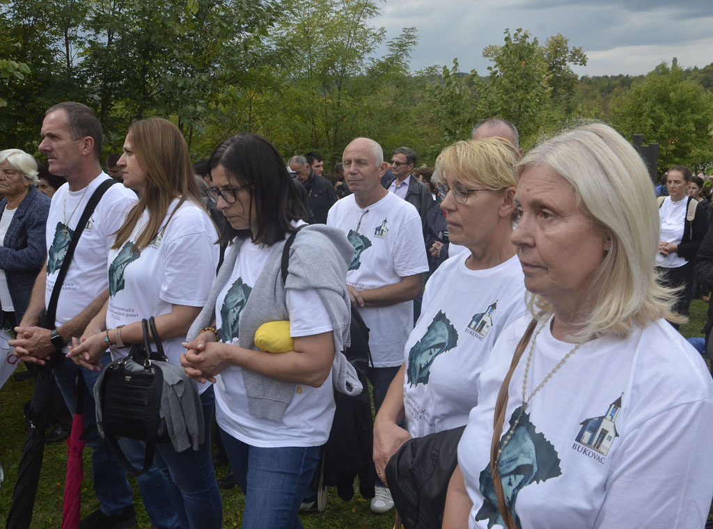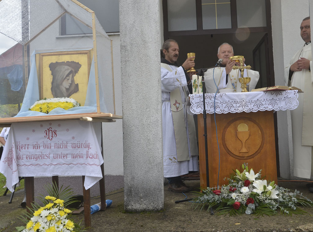 Ni kiša koja je povremeno padala nije spriječila hodočasnike da dostojanstveno u dvorištu crkve sudjeluju na misnom slavlju, koje je uz župnika fra Franju Dalibora Stjepanovića i još šest svećenika predvodio profesor na Franjevačkoj teologiji u Sarajevu fra Ivan Šarčević.