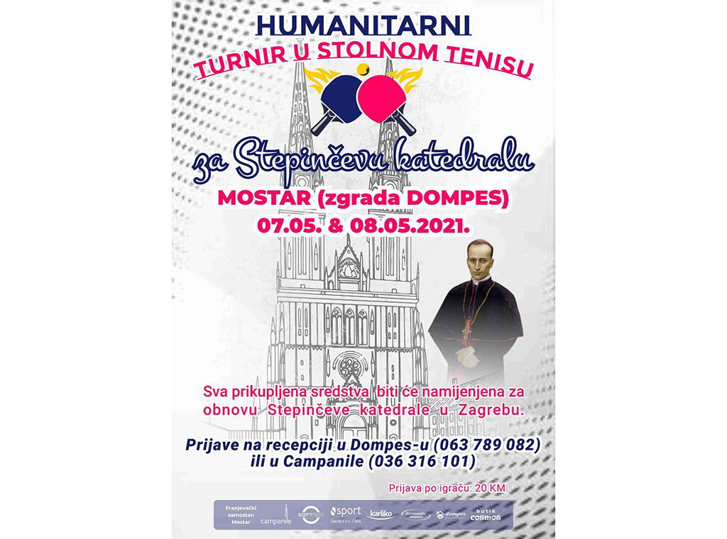 Ravnatelj mostarskog DOMPES-a (Doma kruha i duha) fra Iko Skoko u izjavi za HKR i IKA-u najavio je stolnoteniski turnir koji će se održati 7. i 8. svibnja u sportskoj dvorani DOMPES-a, a sav prihod bit će uplaćen u Fond za obnovu zagrebačke katedrale.