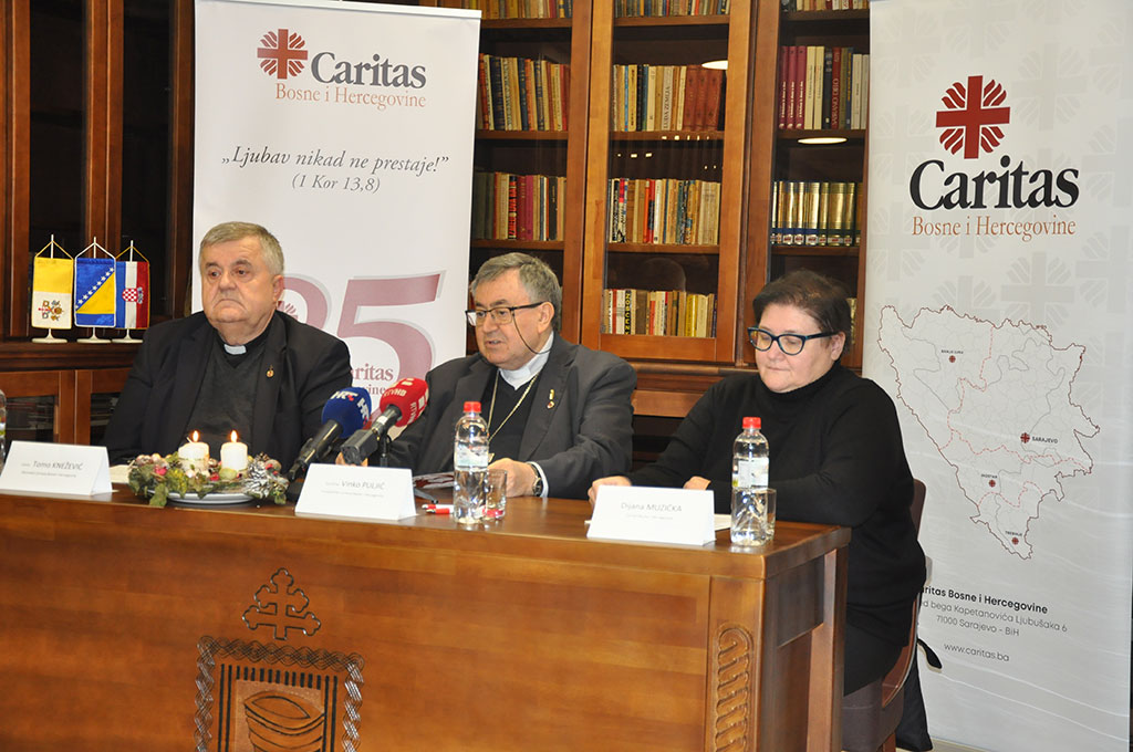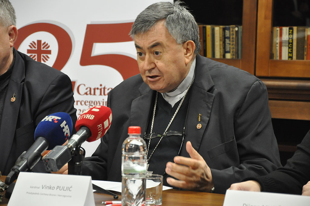 Na početku konferencije, koju je moderirao Miroslav Valenta, novinarima se obratio predsjednik Caritasa BiH, nadbiskup metropolit vrhbosanski Vinko kard. Puljić, koji je najprije odao priznanje medijima što posvećuju pozornost karitativnoj djelatnosti. „Nitko nije izuzet činiti dobro. A mi vjernici napose. U ove predblagdanske, predbožićne dane najveća je sreća na taj način dočekati rođenje Kristovo. Zato zahvaljujem svim djelatnicima Caritasa, koji kroz karitativni rad ostvaruju poslanje Crkve. A naročito zahvaljujem brojnim dobrotvorima“, kazao je kardinal Vinko te naglasio kako je ovogodišnji središnji moto Caritas u životu zajednice i pojedinaca te istaknuo: „… I ove godine želimo svima nama posvijestiti pastoralnu dimenziju ljubavi kako u osobnom životu tako i u životu zajednice. U Zbornoj molitvi 25. nedjelje kroz godinu molimo: 'Bože sav si svoj zakon sveo na ljubav prema tebi i bližnjemu'. Sv. Ivan apostol napisa: 'Upoznali smo ljubav koju Bog ima prema nama i povjerovali joj. Bog je ljubav i tko ostaje u ljubavi u Bogu ostaje i Bog u njemu' (1 Iv 4,16). Na temelju ove Božje riječi valja nam izvući zaključak za život u vjeri i poći u školu ljubavi naše svakodnevice", posvijestio je kardinal i nastavio: