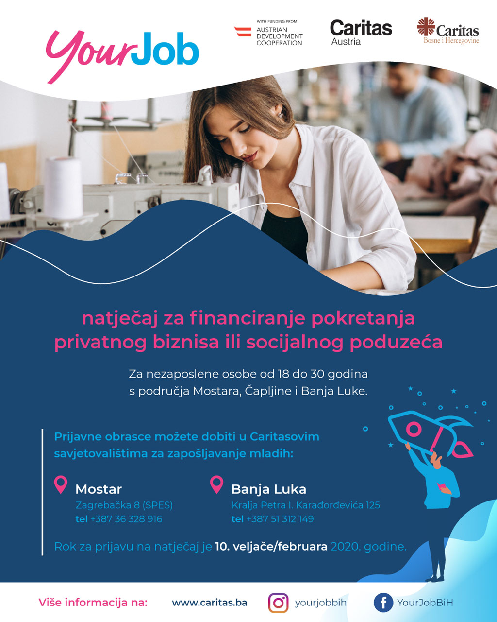 Caritas Bosne i Hercegovine, zajedno s Caritasom biskupije Banja Luka i Caritasom biskupija Mostar-duvno i Trebinje-mrkan, poziva mlade od 18 do 30 godina na sudjelovanje u natječaju za financiranje pokretanja privatnog biznisa ili socijalnog poduzeća u okviru programa "YourJob".