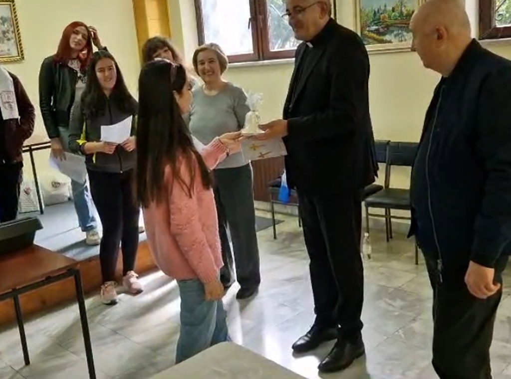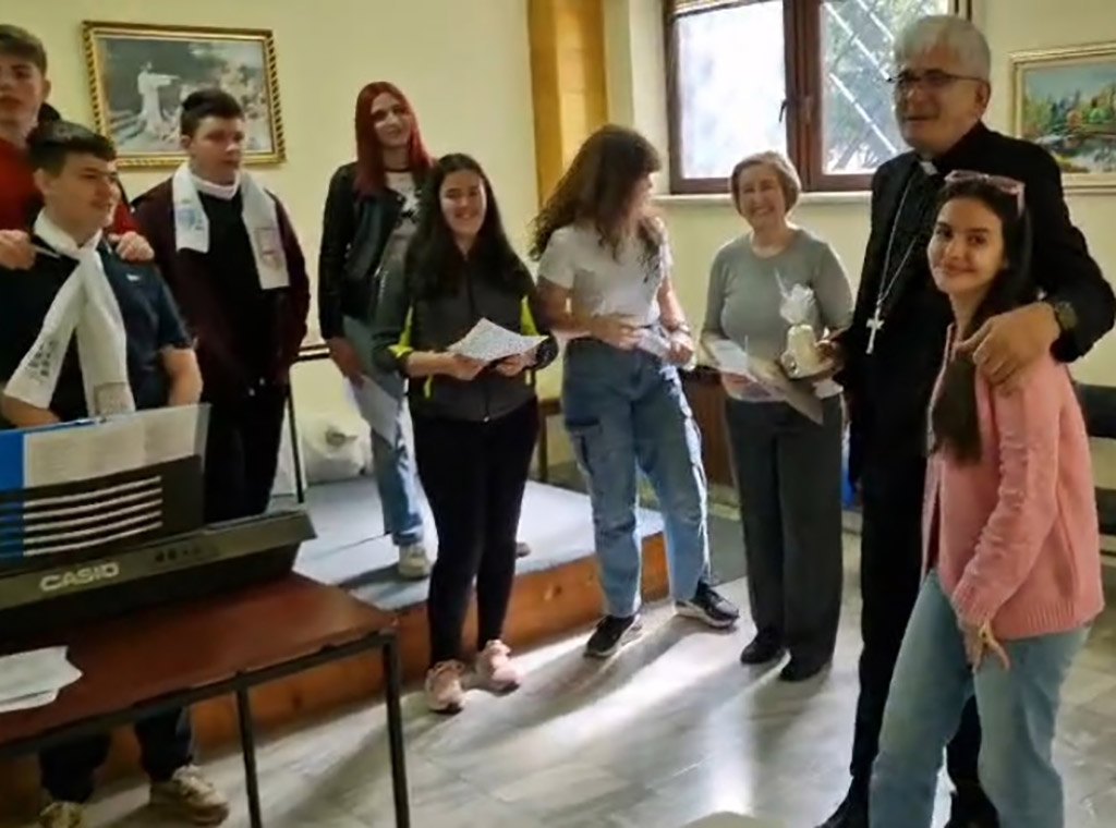 Vjeroučenici su predali biskupu i prigodan dar - Križni put za najmlađe sastavljen od njihovih radova i svijeću, simbol svjetlosti. Također, obradovali su ga i svojom pjesmom In nomine Domini posebno napisanom za novog biskupa na melodiju poznate pjesme Ima jedna duga cesta. Time su ujedno zaželjeli dobrodošlicu svom biskupu Željku.