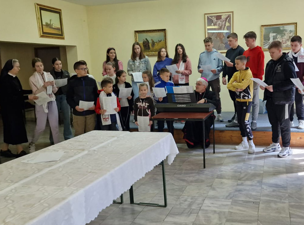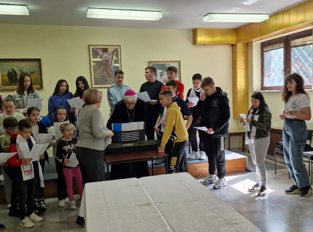 Oduševljen dječjom pjesmom, radošću i ljubavlju pozvao ih je da zajedno idu naprijed "u ime Gospodnje".