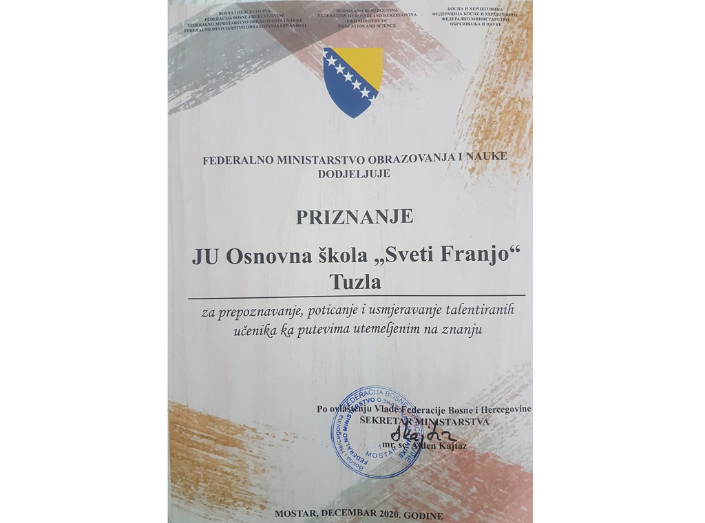 Federalno ministarstvo obrazovanja i znanosti je tijekom prosinca 2020. dodijelilo priznanja najboljim učenicima i školama u Federaciji BiH. Među odgojno-obrazovnim institucijama koje su dobile priznanje je i Osnovna škola koja djeluje u sklopu Katoličkog školskog centra "Sv. Franjo" iz Tuzle.