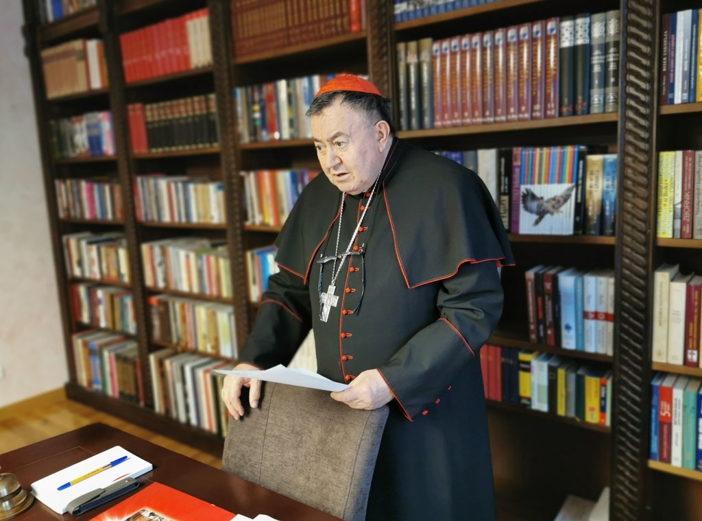 Najprije se auditoriju obratio kardinal koji je pozdravivši nazočne ukratko progovorio o svojoj pastirskoj službi iznijevši pojedine naglaske i donijevši aktualnu statistiku. Novom je nadbiskupu koadjutoru poželio obilje Božjeg blagoslova u službi koju, prema Zakoniku kanonskoga prava, preuzima.