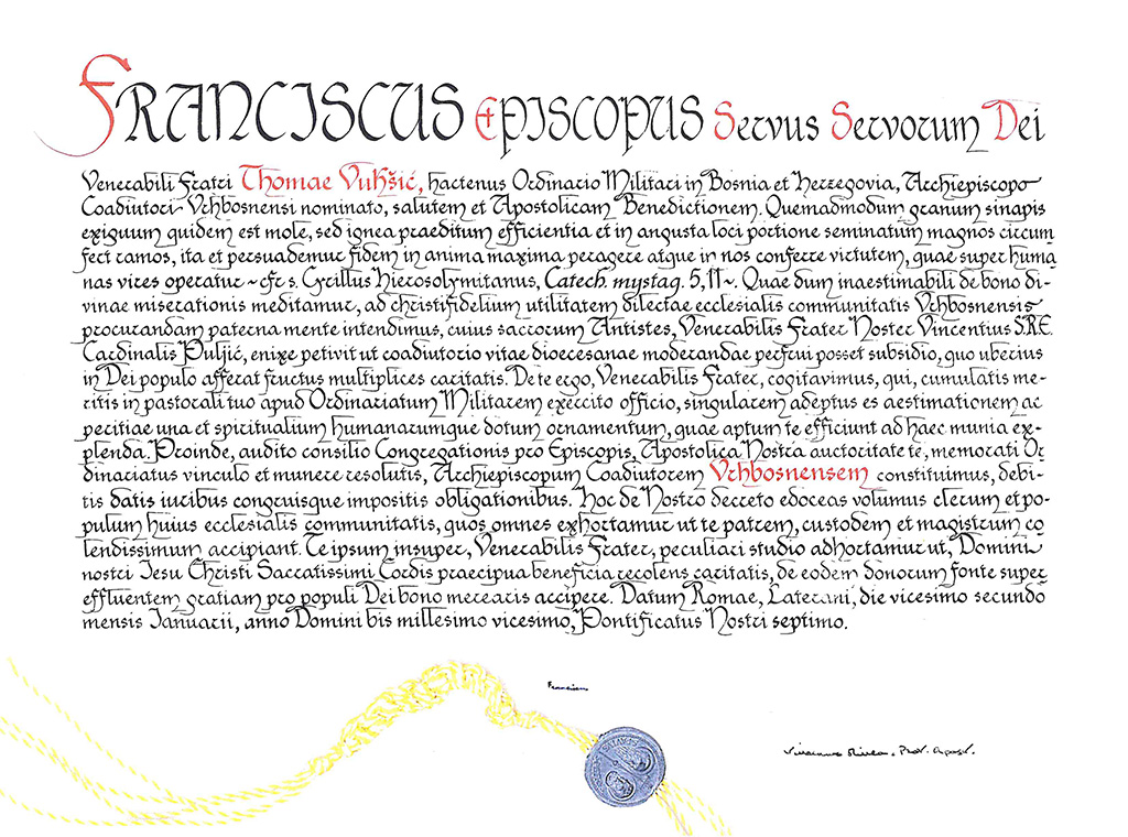 Bula imenovanja mons. Tome Vukšića vrhbosanskim nadbiskupom koadjutorom