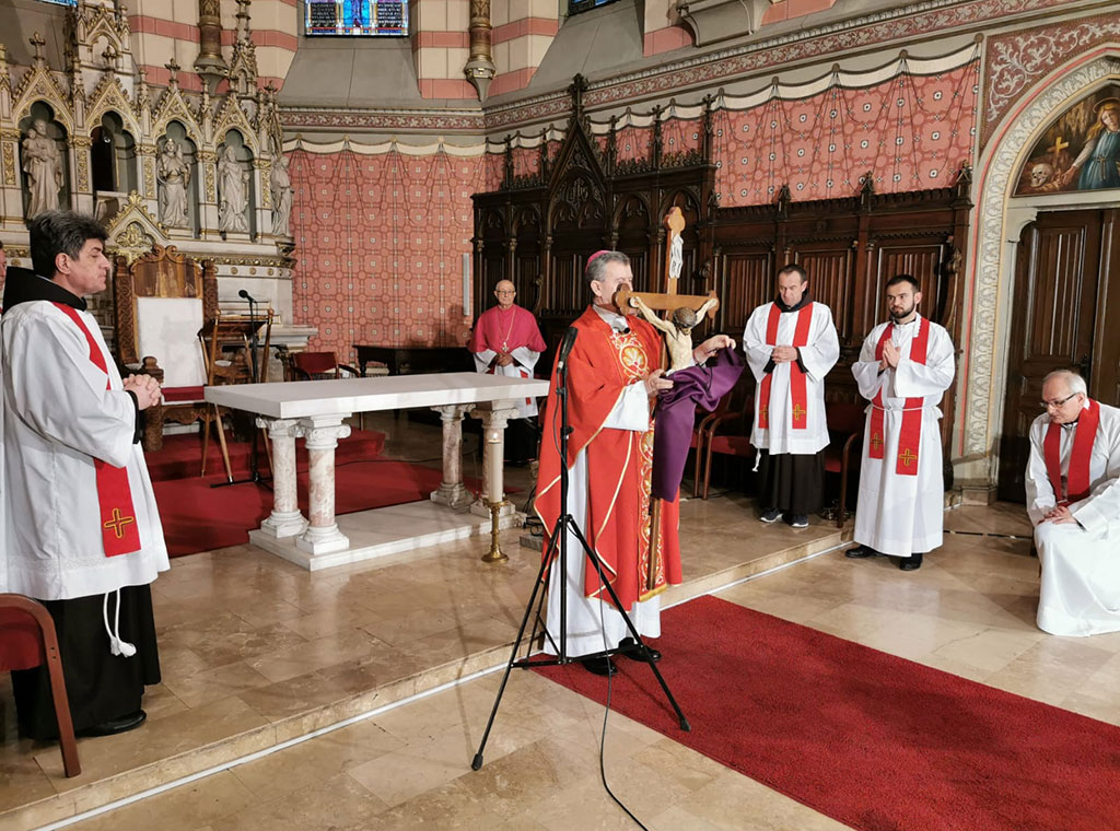 Nakon ulaska i klanjanja oltaru pred kojim je prekriveni križ, svetopisamskih čitanja koja su čitali mons. Ćosić i fra Damir, uslijedila je Muka Gospodina Isusa Krista. Ulogu Isusa čitao je nadbiskup Vukšić, evanđelist je bio mons. Tomašević, a ostale uloge čitao je vlč. Štefan.
