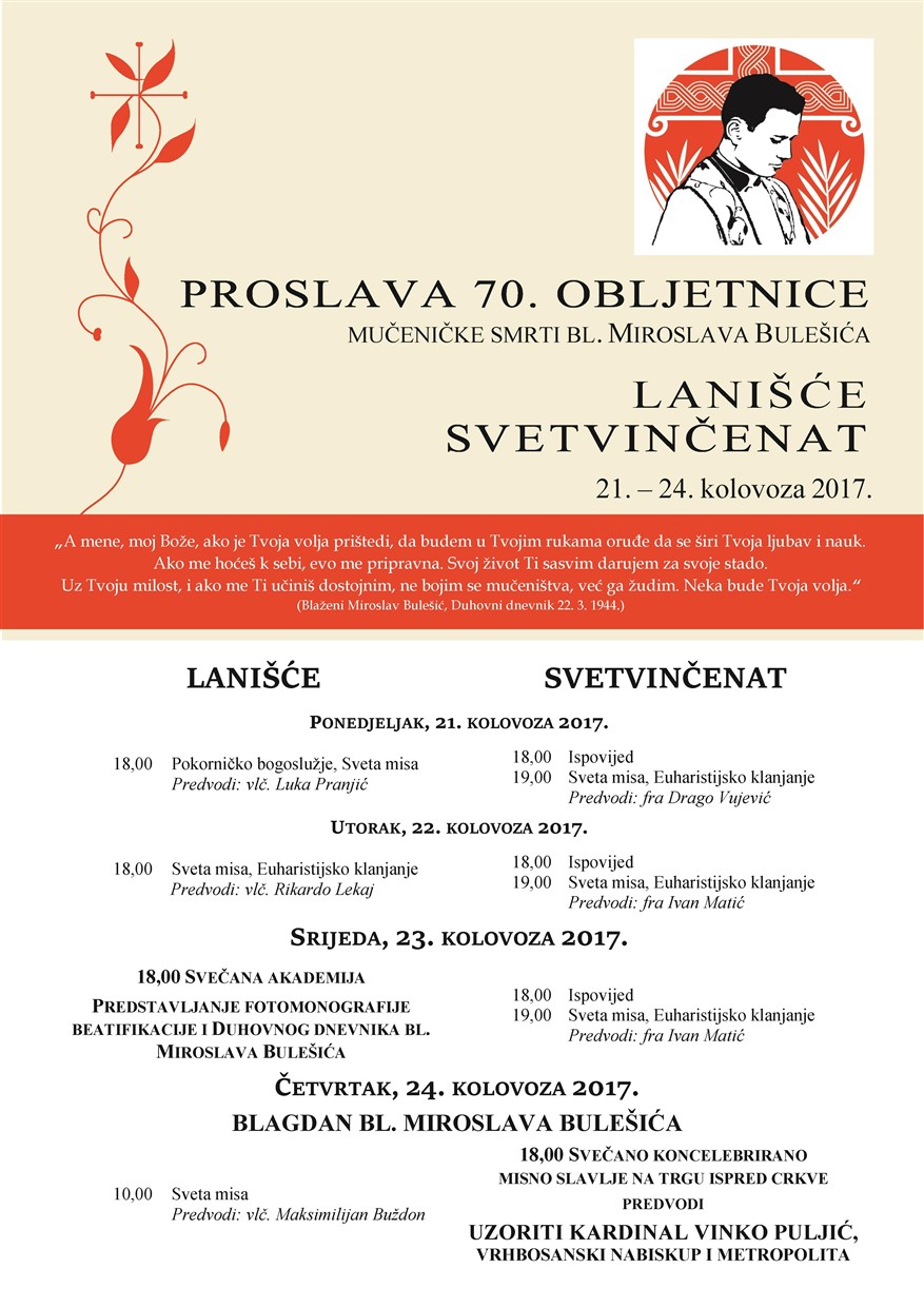 Kako javlja web stranica miroslavbulesic.com u sklopu obilježavanja 70. obljetnice smrti blaženog Miroslava Bulešića, u Lanišću, mjestu njegova mučeništva, u predvečerje same obljetnice, u srijedu, 23. kolovoza 2017. godine, u župnoj crkvi sv. Kancija, Kancijana i Kancijanile, s početkom u 18 sati, bit će upriličena svečana akademija s nizom sadržaja. Održati će se uz ostalo predstavljanje Duhovnog dnevnika bl. Bulešića te predstavljanje monografije o njegovoj beatifikaciji.