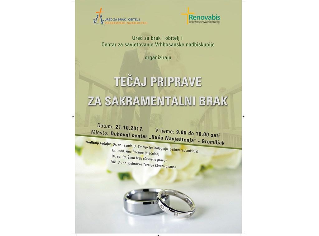 Ured za brak i obitelj i Centar za savjetovanje Vrhbosanske nadbiskupije nastavlja s ciklusom tečaja priprave za sakramentalni brak za godinu 2017./2018.