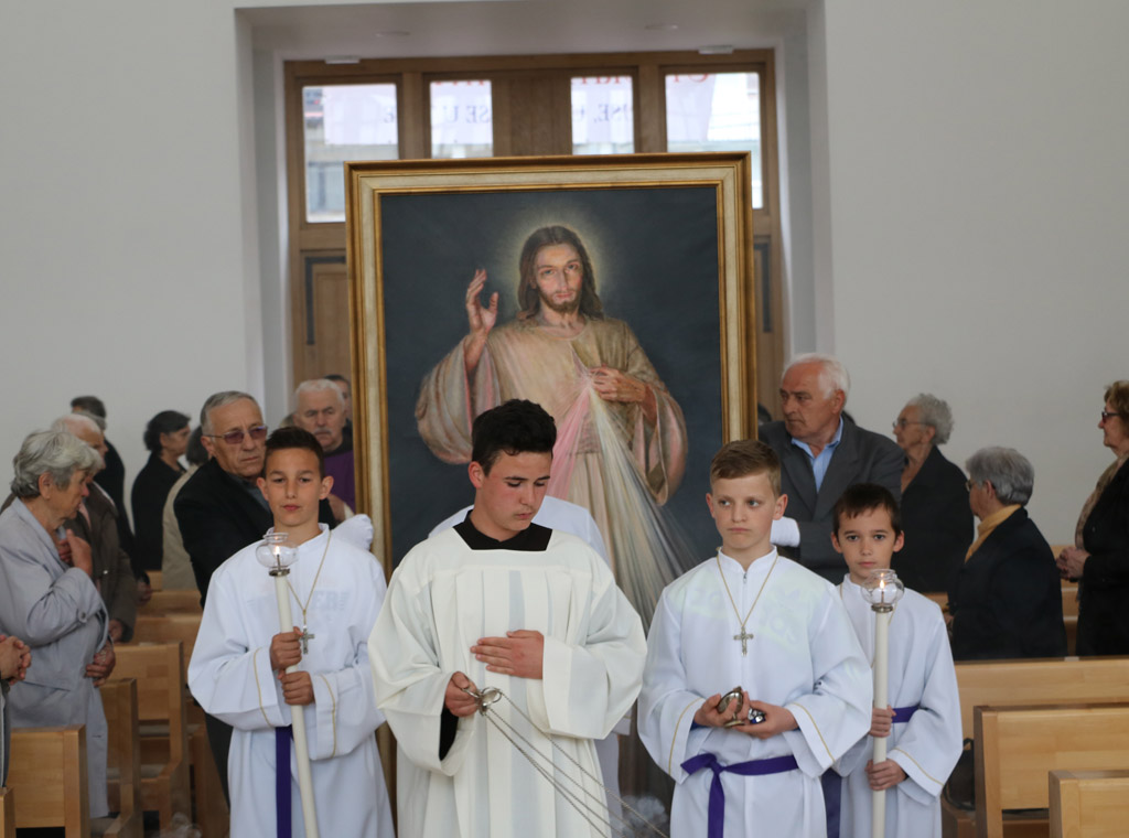 Zatim je blagoslovio slike Milosrdnog Isusa koje su bile pripremljene za svaku obitelj u župi i svečano „intronizirao“ veliku sliku Milosrdnog Isusa uz molitve i pjesme.