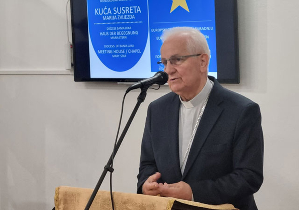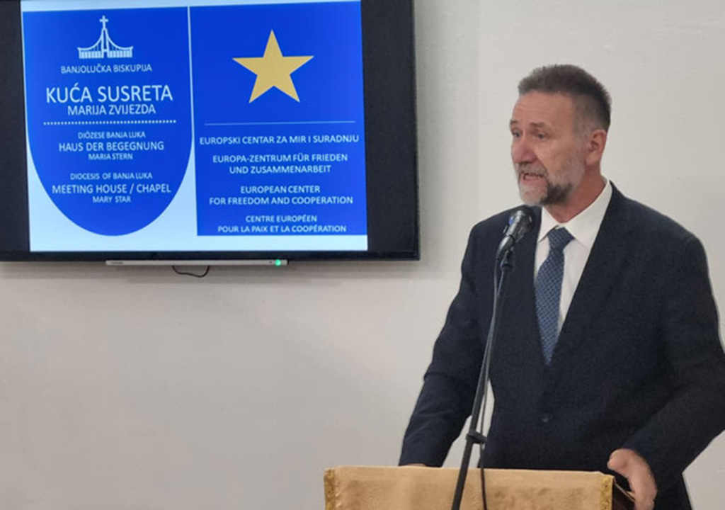 „Još prije 16 godina osnovali smo u našem gradu uz pomoć prijatelja i dobročinitelja iz Njemačke, Europsku akademiju Banjolučke biskupije. Ona je bila zamišljena kao zametak Europskog centra, kojega smo planirali malo iza toga ostvariti i izgraditi upravo u Mariji Zvijezdi. Uslijed konstantnog – još uvijek aktualnog – pomanjkanja političke volje od strane najodgovornijih političkih dužnosnika u zemlji – domaćih i stranih – da se Katoličkoj Crkvi vrati barem onaj dio bespravno uzurpirane – ne one daleko veće nacionalizirane(!) – imovine Marija Zvijezde, formalno osnivanje Europskog centra za mir i međuetničku i međunarodnu suradnju se ostvarilo, tek prošle 2020., uz obilježavanje 195-te obljetnice rođenja utemeljitelja Marija Zvijezde – Sluge Božjeg o. Franje (Franza) Pfannera. I danas, evo, ovim skromnim, ali znakovitim programom, obilježavamo 1. godišnjicu postojanja Centra“, kazao je biskup Franjo, zahvalivši se pritom svima na podršci koju je ovaj centar dobio, prije svega Vladi Republike Hrvatske, Brodsko-posavskoj županiji, katoličkoj organizaciji Renovabis i Paneuropskoj uniji.