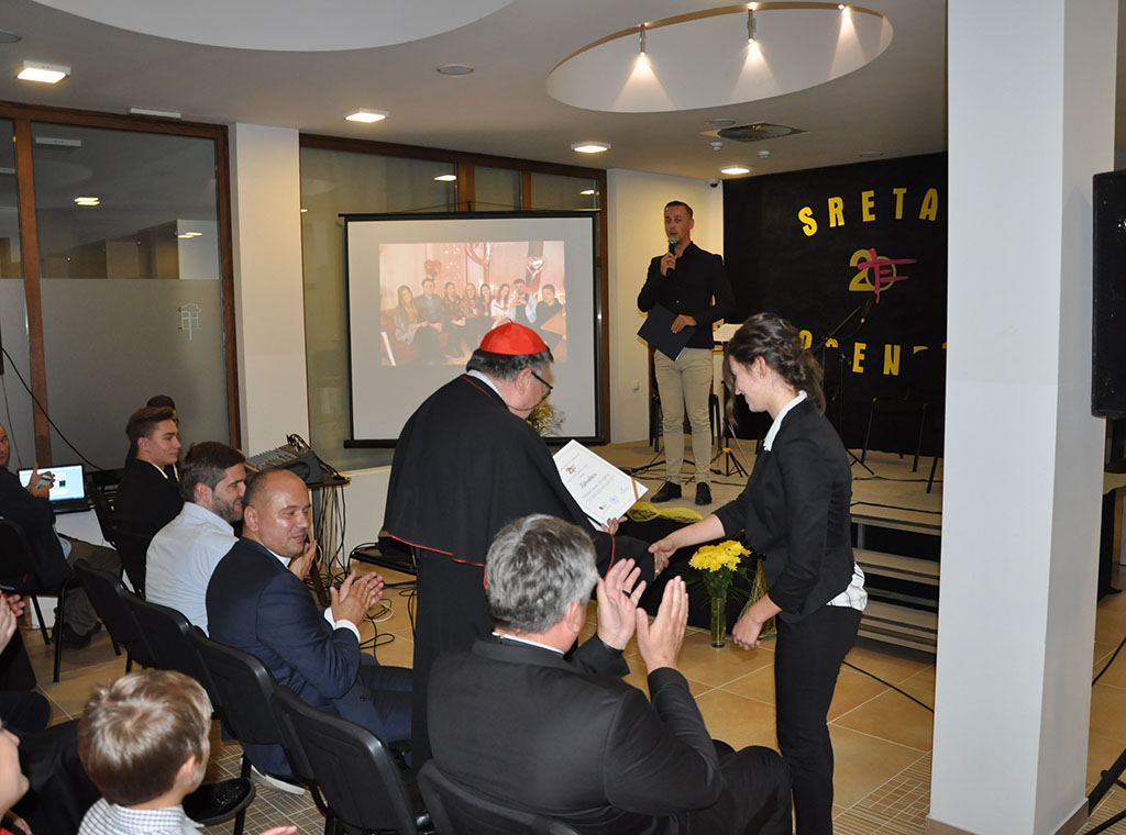 Nakon mise upriličen je prijem u auli Centra, a moderator je bio Josip Milanović, uposlenik Nadbiskupijskog centra za pastoral mladih Ivan Pavao II. Nazočne je najprije pozdravio kardinal istaknuvši kako je „dar živjeti 20 godina“. „Teško mi je prisjetiti svih trenutaka, ali znam da sam se radovao tim početcima. Neki moji suradnici su bili skeptični, a meni je važno bilo da krene udruživanje jer samo zajedno možemo uspjeti. Želim ohrabriti nazočne nemojte posustati kao katoličko društvo. Želim da se družite i Isusa prepoznate te se takvi vratite u društvo“, rekao je kardinal.
