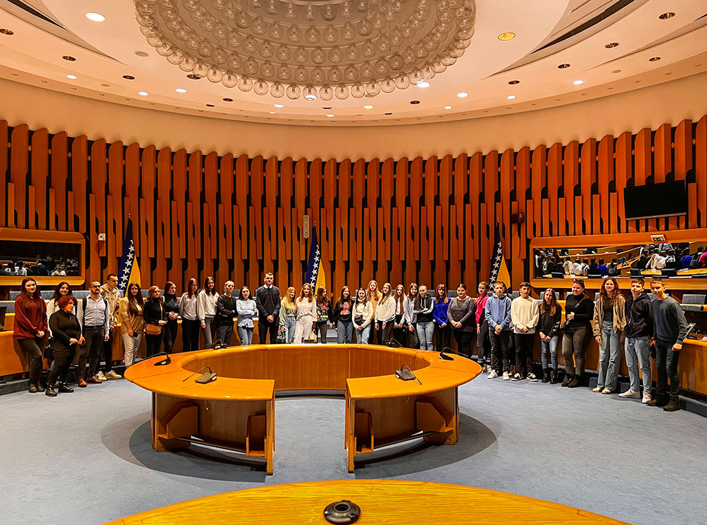 Također, osim aktivnosti u NCM-u upriličen je i posjet Parlamentarnoj skupštini Bosne i Hercegovine gdje ih je dočekao voditelj Odjela za javnost i medije Parlamentarne skupštine BiH Zoran Brkić. Mladi su tako mogli praktično učiti o državnom ustrojstvu BiH, detaljno se upoznati s funkcioniranjem Parlamentarne skupštine te dobiti uvid u proces odlučivanja i donošenja odluka. Pod stručnim vodstvom sudionici su imali privilegiju ući u Bijelu dvoranu, mjesto gdje se održavaju sjednice Zastupničkog doma, kao i Plavu dvoranu gdje se održavaju sjednice Doma naroda. Ova neposredna interakcija pružila im je jedinstvenu prigodu postavljati pitanja i dobivati odgovore iz prve ruke, stvarajući slikovit dojam o političkom procesu u zemlji. Posjet je bio iznimno informativan omogućujući bolje razumijevanje ključnih aspekata rada Parlamenta i demokratskih institucija u državi.