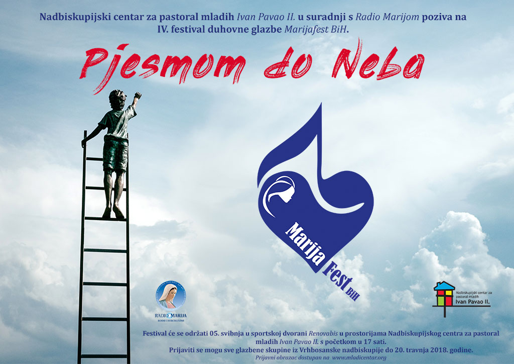 Nadbiskupijski centar za pastoral mladih (NCM) Ivan Pavao II. u suradnji s Radio Marijom BiH organizira četvrti festival duhovne glazbe za mlade Marijafest BiH koji će se ove godine održati pod geslom Pjesmom do Neba.