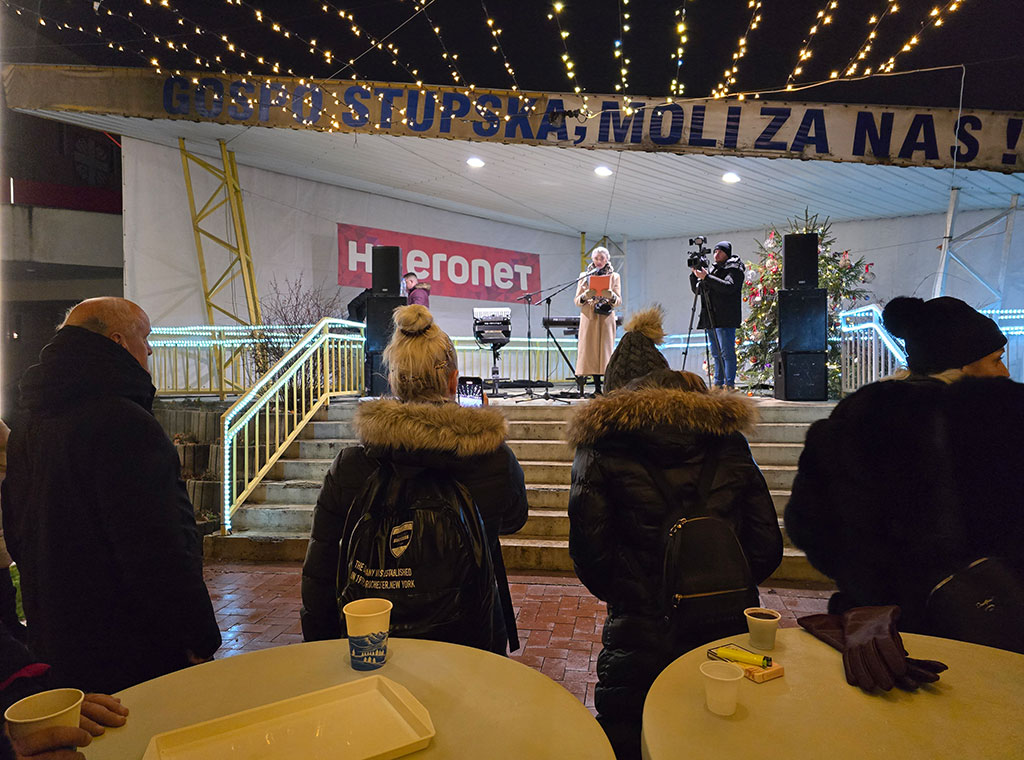 Prije zabavnog dijela programa nazočnima je riječi dobrodošlice uputio i predsjednik HKUD-a Don Ivan Trobentar Aco Posavljak. Podsjetio je kako je to šesta Advent na Stupu za čiju su organizaciju, uz podršku prijatelja, zaslužni župljani i članovi HKUD-a. „Iznimno sam ponosan što upravo ovdje, u ozračju došašća, dijelimo trenutke radosti, zajedništva i blizine Kristu kroz naša djela milosrđa i pomaganje onima kojima je to najpotrebnije“, poručio je Posavljak uz podsjećanje na humanitarni karakter same manifestacije. „Advent je započeo paljenjem prve svijeće, simbola nade i vjere. Kada biramo put kojim želimo ići i kada se usudimo sanjati, upravo nas nada i vjera vode prema ostvarenju naših snova. Na našem adventskom putu na Stupu vodilo nas je jedno – zajedništvo. Imali smo zajednički cilj: uljepšati Božić onima koji si ga ne mogu priuštiti“, istaknuo je uz želju da se svi gosti osjećaju ugodno.