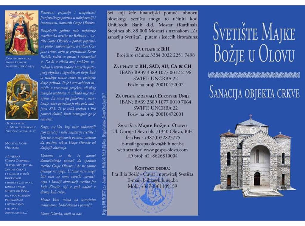 Naravno da će za slijedeću fazu trebati izdvojiti ponovno velike novce i zbog toga iz svetišta apeliraju svima – štovateljima, hodočasnicima i prijateljima, ali i posjetiteljima ovog Svetišta Gospe Olovske i Nacionalnog spomenika kulture koji mogu i žele da pomognete u ovom nastojanju.