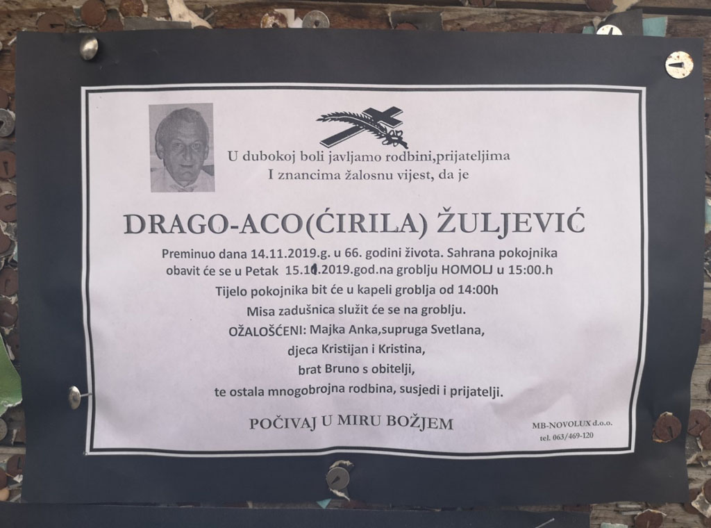Na mjesnom groblju Homolj u župi Banbrdo (Lepenica) 15. studenoga pokopan je Drago-Aco Žuljević, otac lektorice "Katoličkog tjednika" Kristine Žuljević.