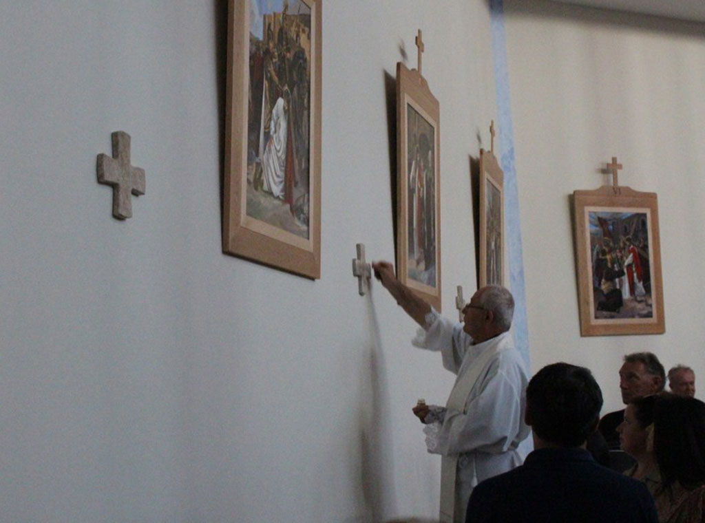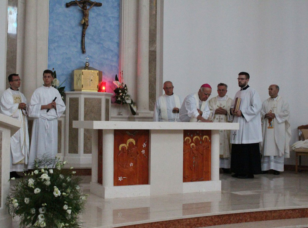 Biskup Perić je, pozdravivši župnika i župljane, na početku svete mise izmolio blagoslovnu molitvu nad vodom kojom je poškropio narod i zidove crkve. On je svetim uljem pomazao oltar, a župnika ovlastio da istim svetim uljem pomaže 12 malih križeva koji su pričvršćeni na zidovima crkve.