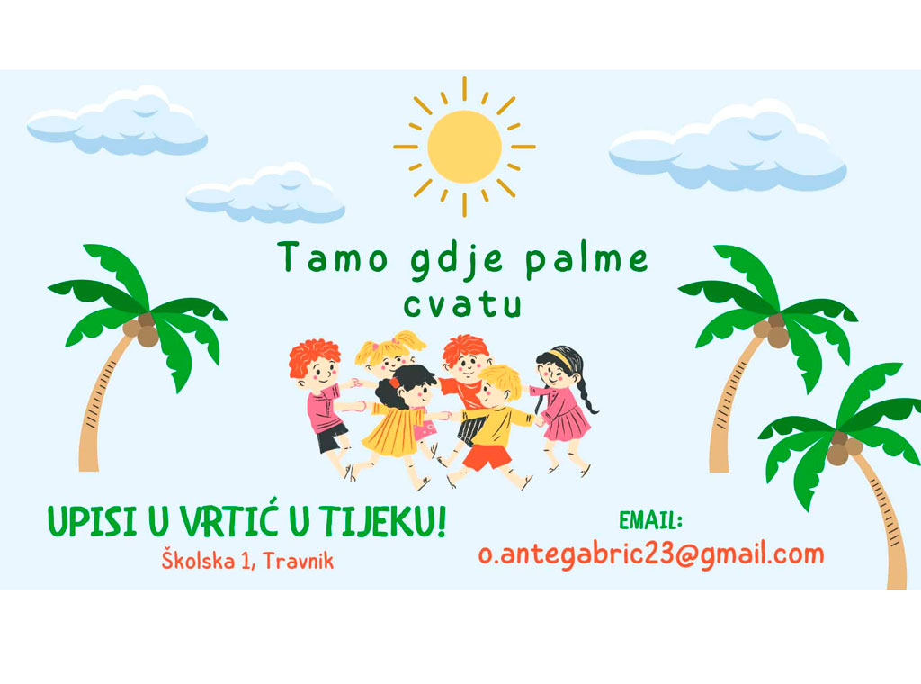 Privatna predškolska ustanova "o. Ante Gabrić" u Travniku raspisuje natječaj za prijem djece na koji se mogu prijaviti roditelji ili staratelji djece uzrasne dobi od jedne godine do polaska u školu.