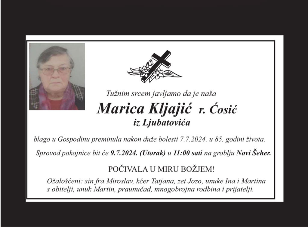 U 85. godini života u Žepču je u nedjelju, 7. srpnja preminula Marica Kljajić, majka svećenika fra Miroslava Kljajića, vojnog kapelana u Banja Luci.