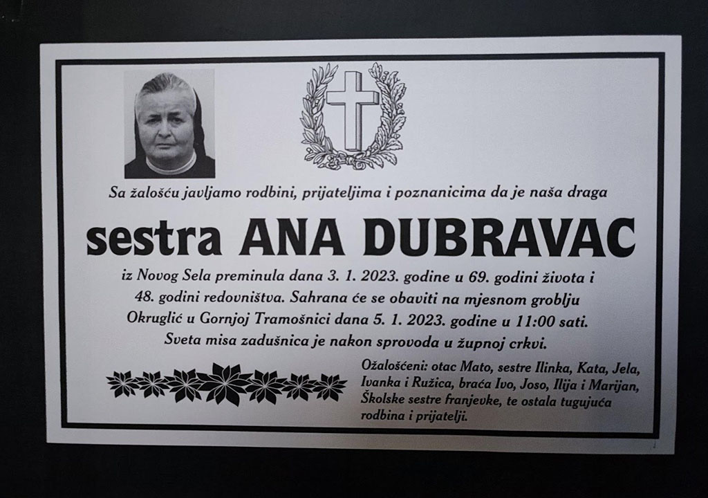 Ukop zemnih ostataka pokojne s. Ane bit će u četvrtak, 5. siječnja u 11:00 na grblju Okuglić u Gornjoj Tramošnici, a sv. misa zadušnica istoga dana nakon sprovodnih obreda u župnoj crkvi.