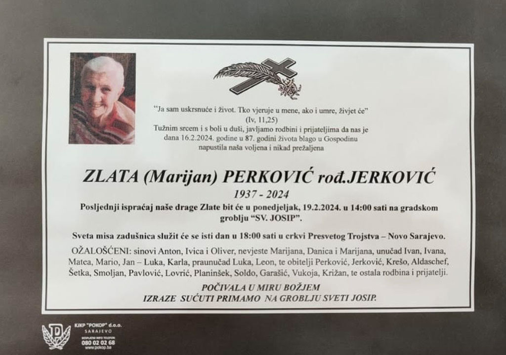 U petak, 16. veljače u svojoj 87. godini života u Sarajevu preminula je Zlata Perković rođ. Jerković, majka pokojnog svećenika Vrhbosanske nadbiskupije vlč. Marinka.