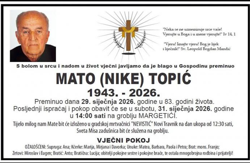 Posljednji ispraćaj i pokop obavit će se u subotu 31. siječnja u 14h na groblju Margetići pokraj Novog Travnika gdje će biti služena i sveta misa zadušnica.