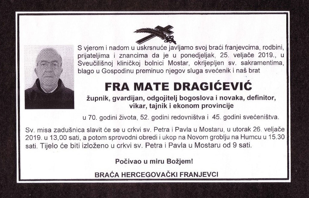U Sveučilišnoj kliničkoj bolnici Mostar, okrijepljen sv. sakramentima, blago je u Gospodinu preminuo 25. veljače njegov sluga svećenik fra Mate Dragićević u 70. godini života, 52. godini redovništva i 45. godini svećeništva.
