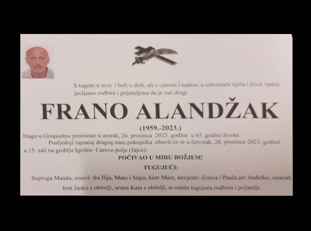 U utorak 26. prosinca, u 65. godini života preminuo je Franjo Alandžak, otac fra Ilije, svećenika franjevačke provincije Bosne Srebrene.
