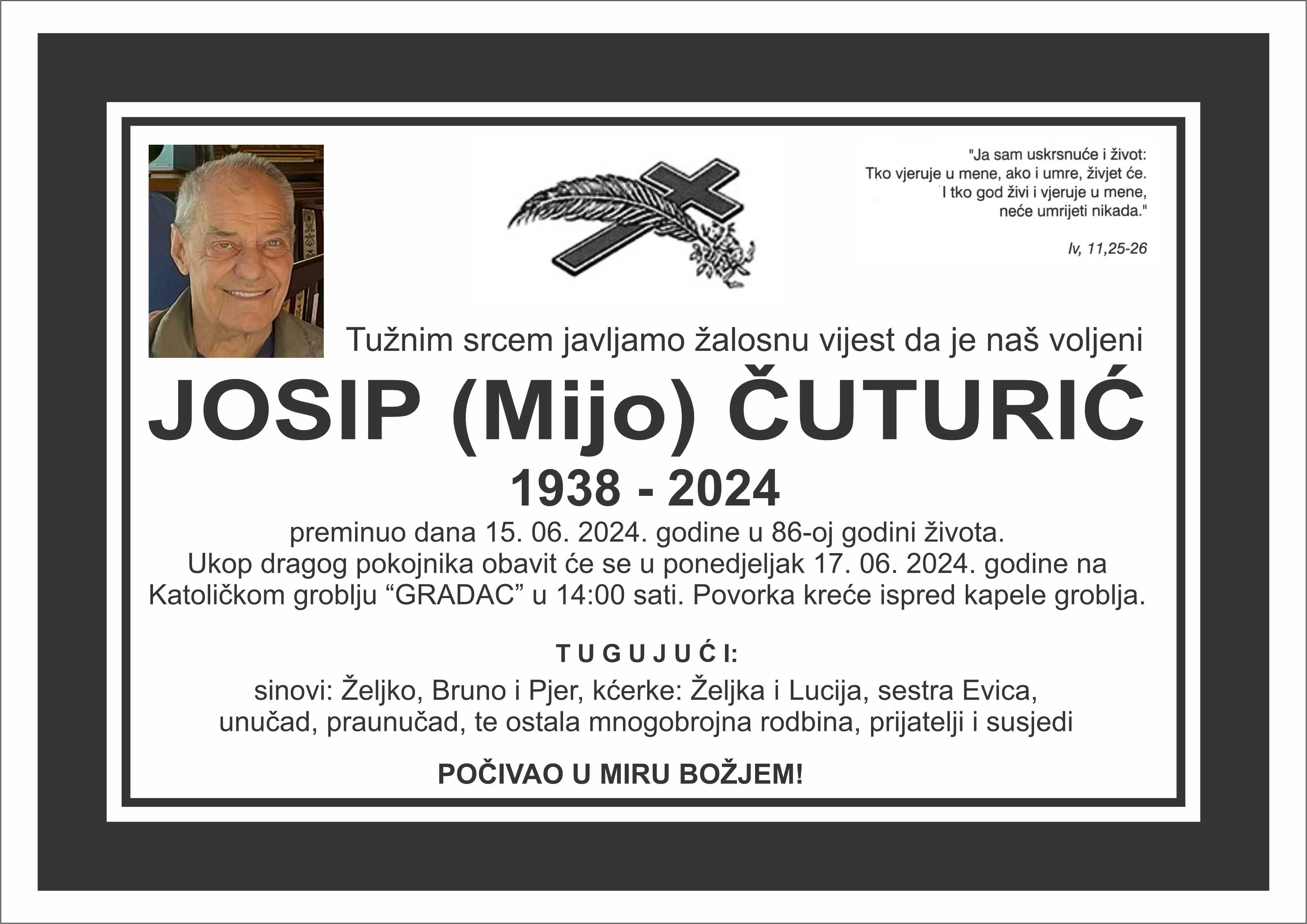 U 86. godini života u Zenici je u subotu, 15. lipnja preminuo Josip Čuturić, otac vrhbosanskog svećenika mons. Željka Čuturića, generalnog vikara Vojnog ordinarijata i župnika u Tarčinu.
