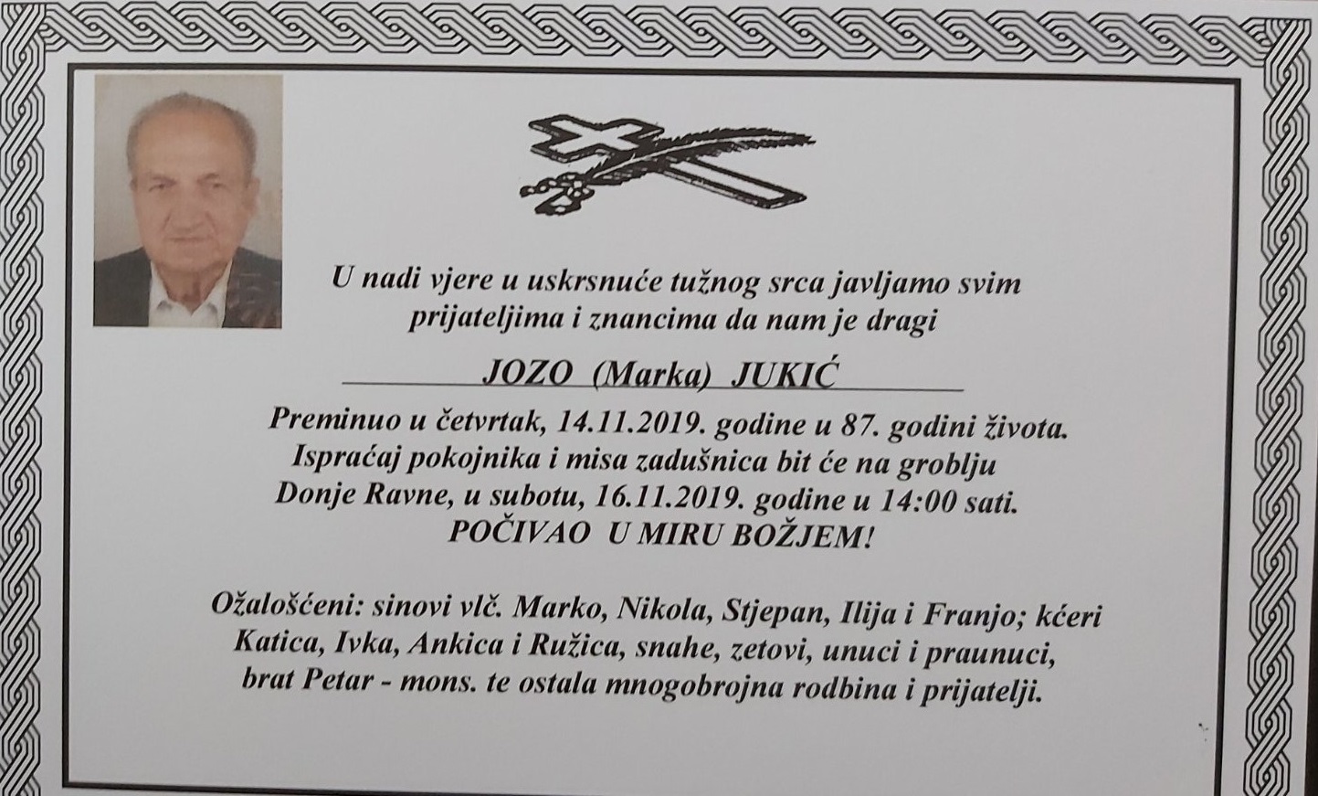Jozo Jukić, otac vrhbosanskog svećenika Marka, preminuo je u četvrtak 14. studenoga u 87. godini.