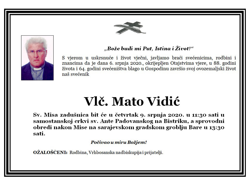 Okrijepljen svetim sakramentima, 6. srpnja, u 88. godini života i 64. godini prezbiterata preminuo je svećenik Vrhbosanske nadbiskupije vlč. Mato Vidić.