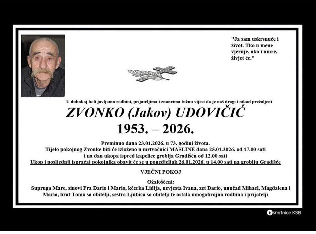 U petak, 23. siječnja, nakon kratke i teške bolesti u obiteljskoj kući u Zenici u 73. godini života preminuo je Zvonko Udovičić, otac fra Darija Udovičića, svećenika franjevca Bosne Srebrene, župnika u župi Bezgrješnog začeća BDM u Dubravama.