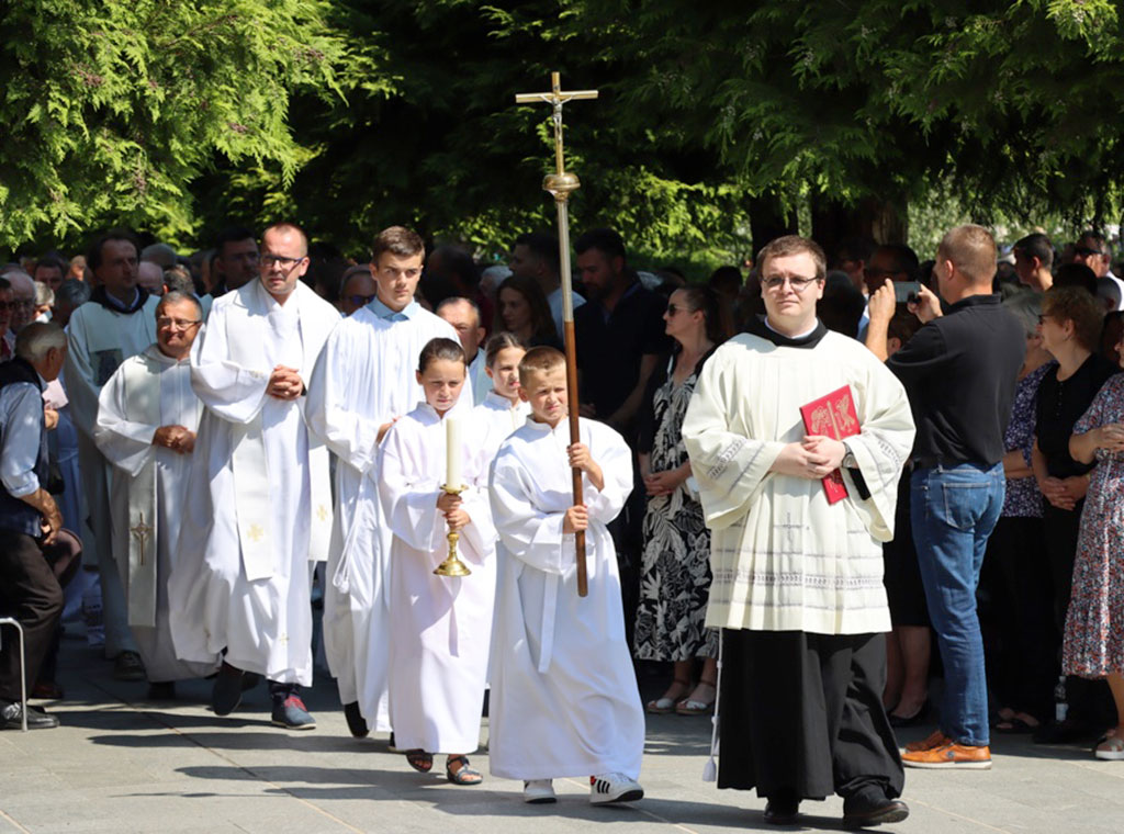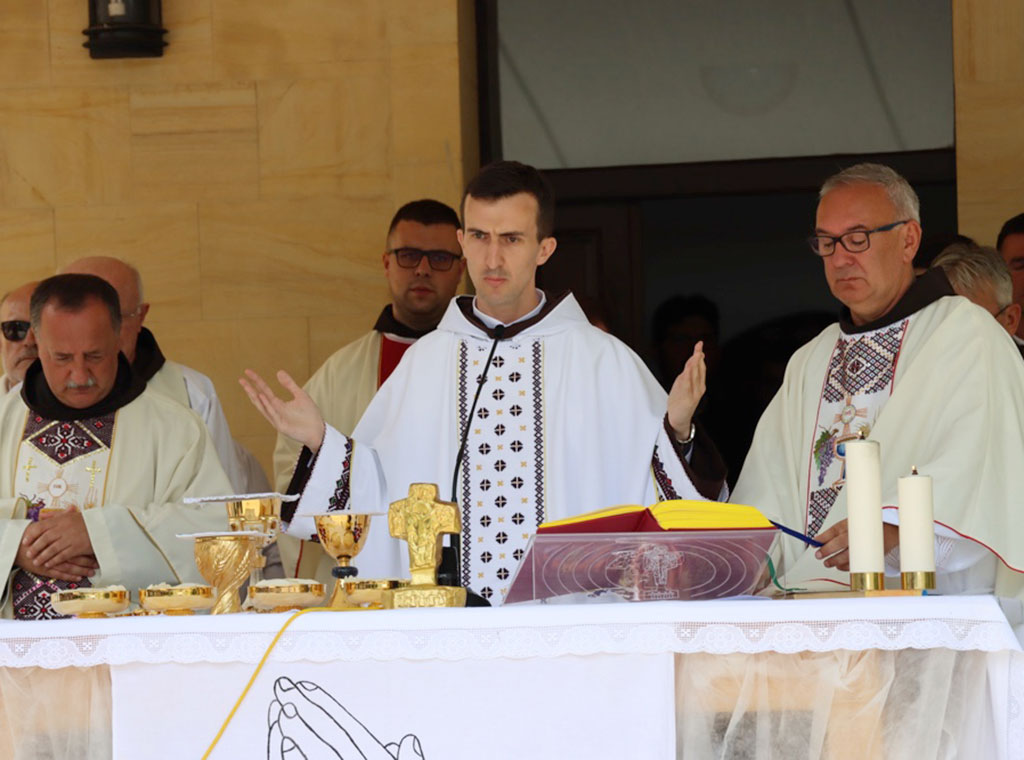 U dvorištu samostanskog kompleksa i župne crkve, svečano euharistijsko slavlje, pod geslom Veliča duša moja Gospodina predvodio je mladomisnik fra Mile. Propovijed je uputio definitor Bosne Srebrene i duhovnik na Franjevačkoj teologiji u Sarajevu fra Miro Relota, dok je mladomisnikov crkveni kum bio šćitski gvardijan i župnik fra Andrija Jozić, koji je uputio riječi pozdrava i dobrodošlice na početku, a civilni kum bio je Anto Jeličić.