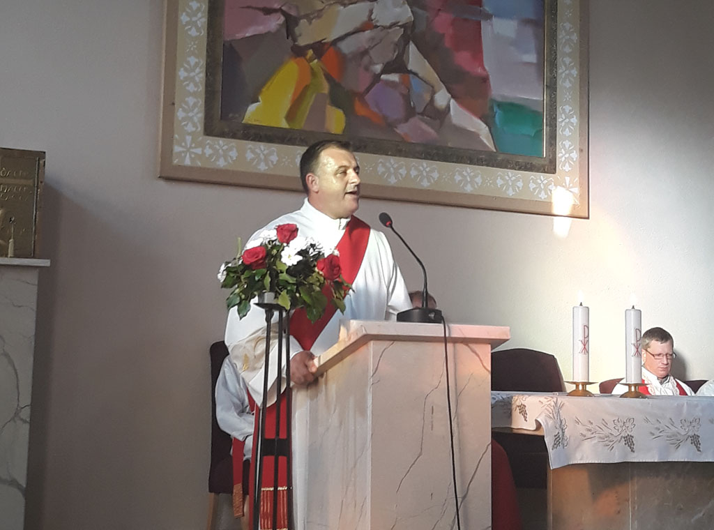Propovijedao je vlč. Robert Čabraja, trajni đakon na službi u župi Gornja Močila - Sijekovac. On je iz perspektive oženjenog muškarca koji je, usprkos činjenici da mu roditelji žive u Berlinu, odlučio ostati na rodnoj grudi, govorio o odgoju u obitelji te životnim poteškoćama danas.