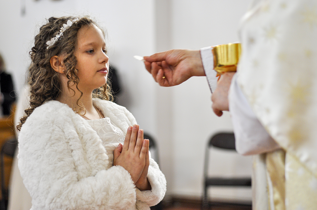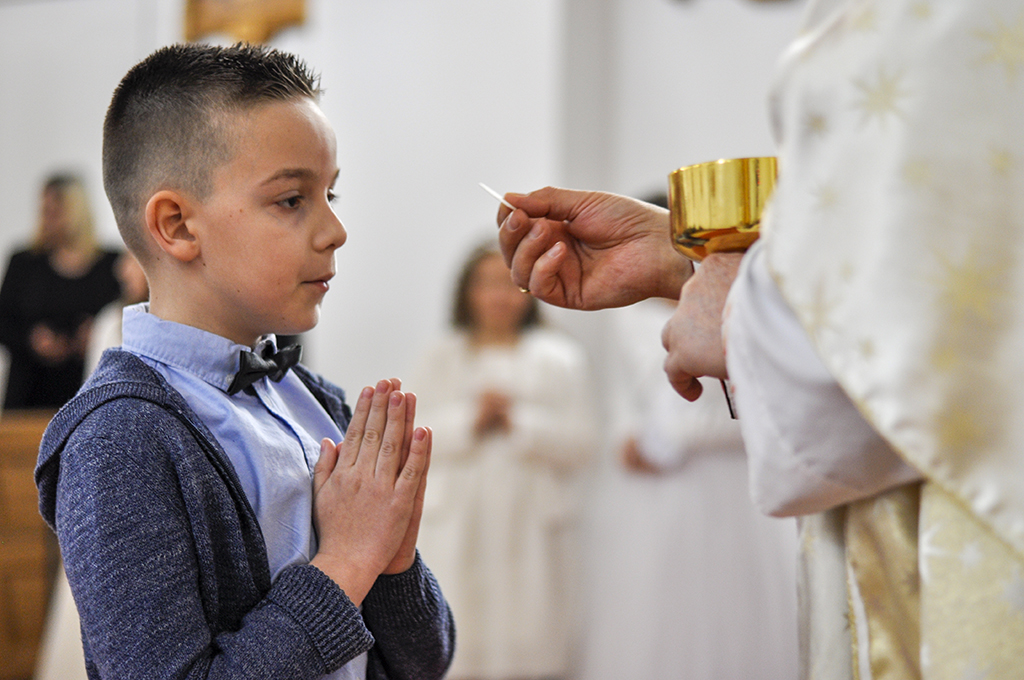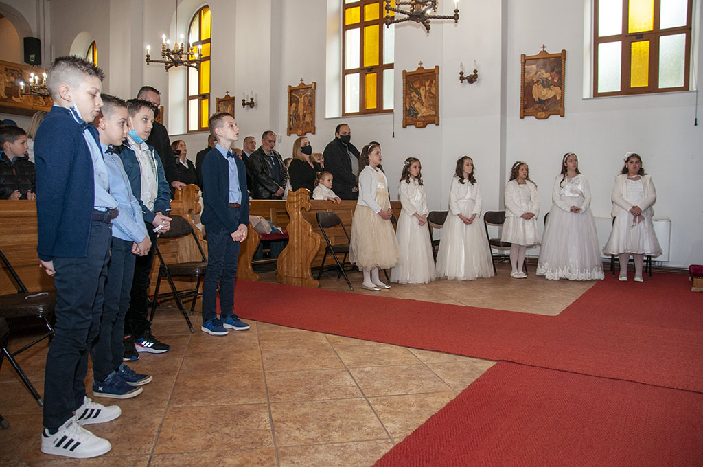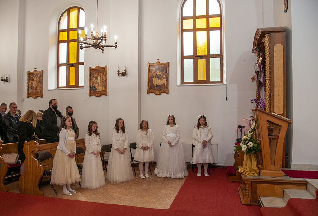 Na početku obreda pričesti kardinal Puljić je prvi put pričestio šest djevojčica i četiri dječaka iz župe Stup.