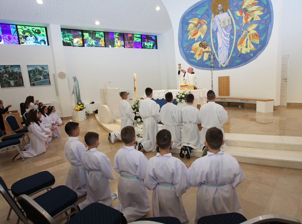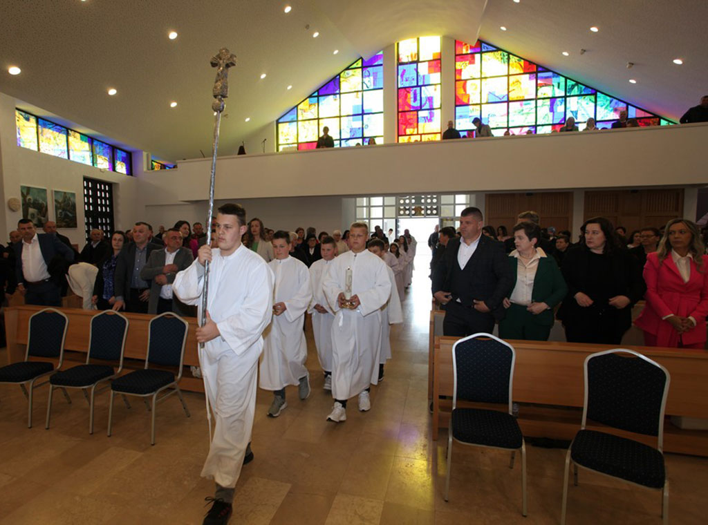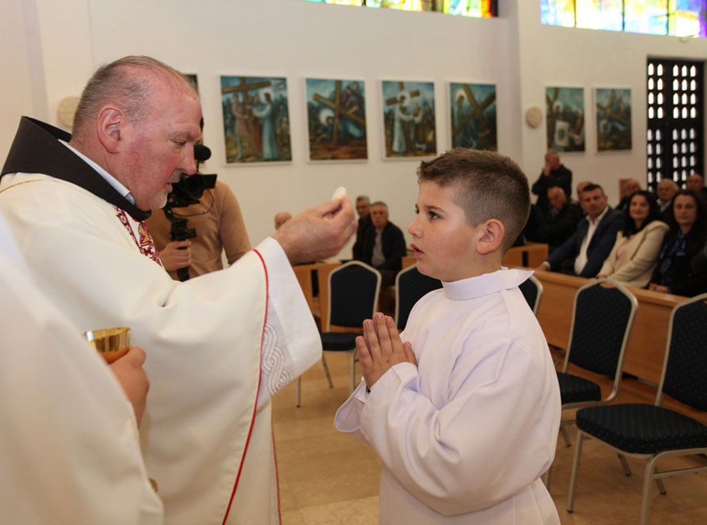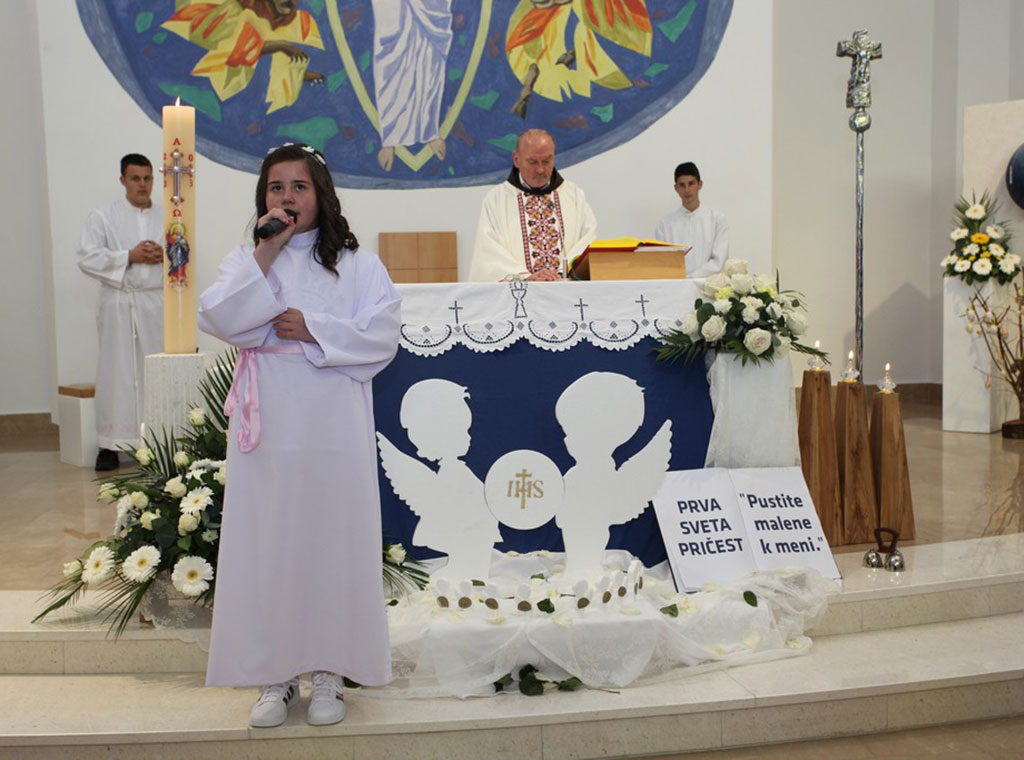 Svečano misno slavlje predvodio je župnik fra Ilija Jurić. On je na početku pozdravio prvopričesnike i njihove roditelje, kao i cijeli nazočni puk, a prije same svete mise svojom recitacijom sve je pozdravila prvopričesnica Julijana Burečić.