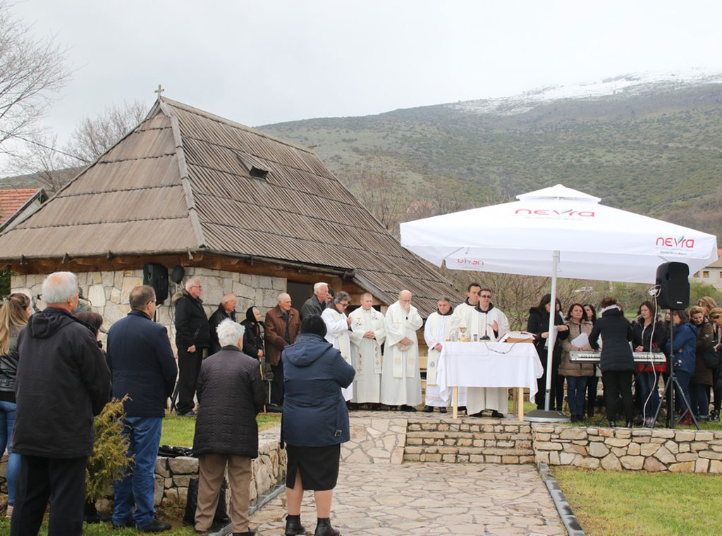 Okupljanje je započelo svetom misom koju je, u krugu replike stare ramske kuće – doma Dive Grabovčeve, predvodio sin ove župe fra Ivan Lovrić, trenutno župnik u župi Ljubunčić kod Livna, uz suslavlje rumbočkog župnika fra Jure Perića i još nekoliko svećenika.