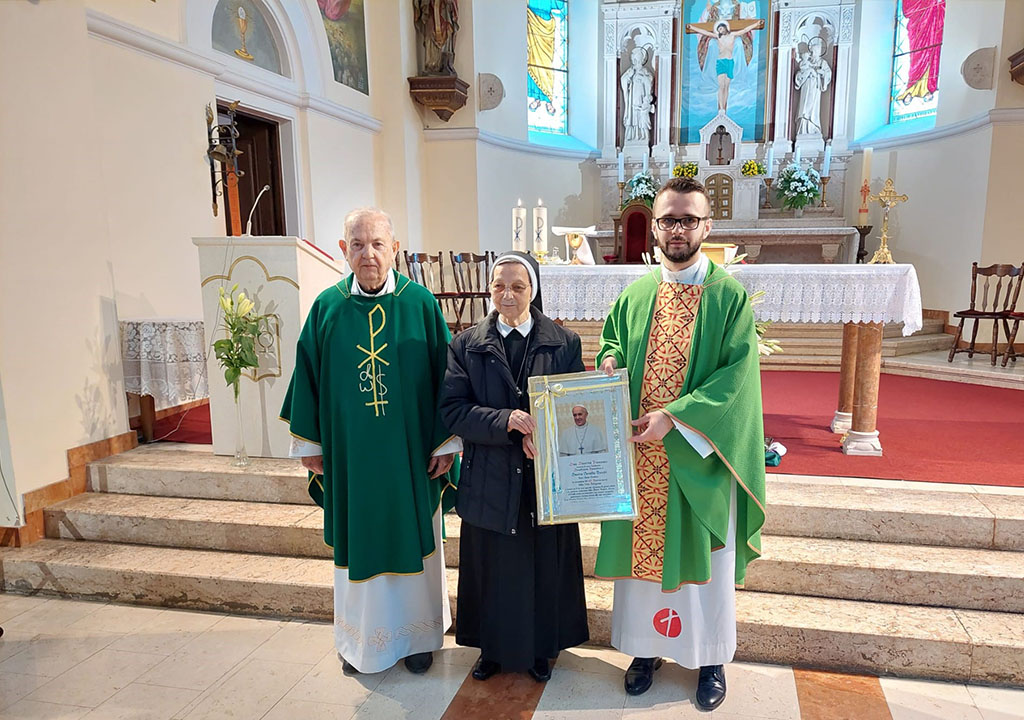 Na kraju euharistijskog slavlje riječi zahvale i čestitku s. Geraldi izrekao je župnik Kustura, a u ime župne zajednice prigodni dar: papinski apostolski blagoslov i cvijeće slavljenici je uručila članica župnog pastoralnog vijeća Sanela Kozina.